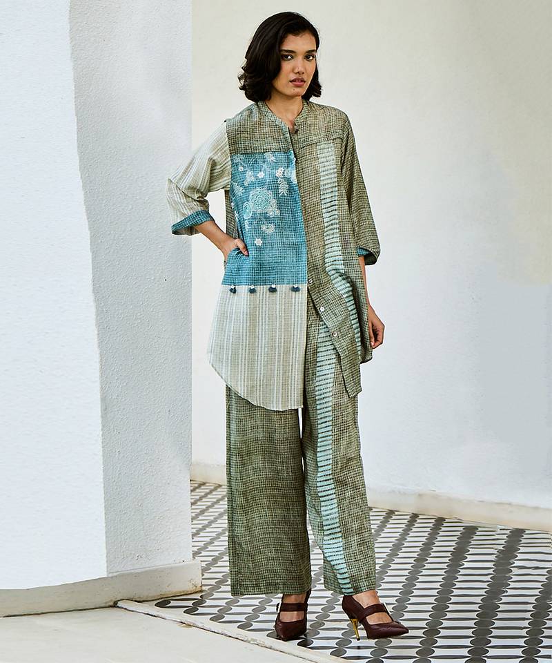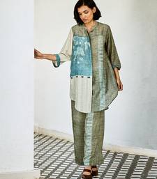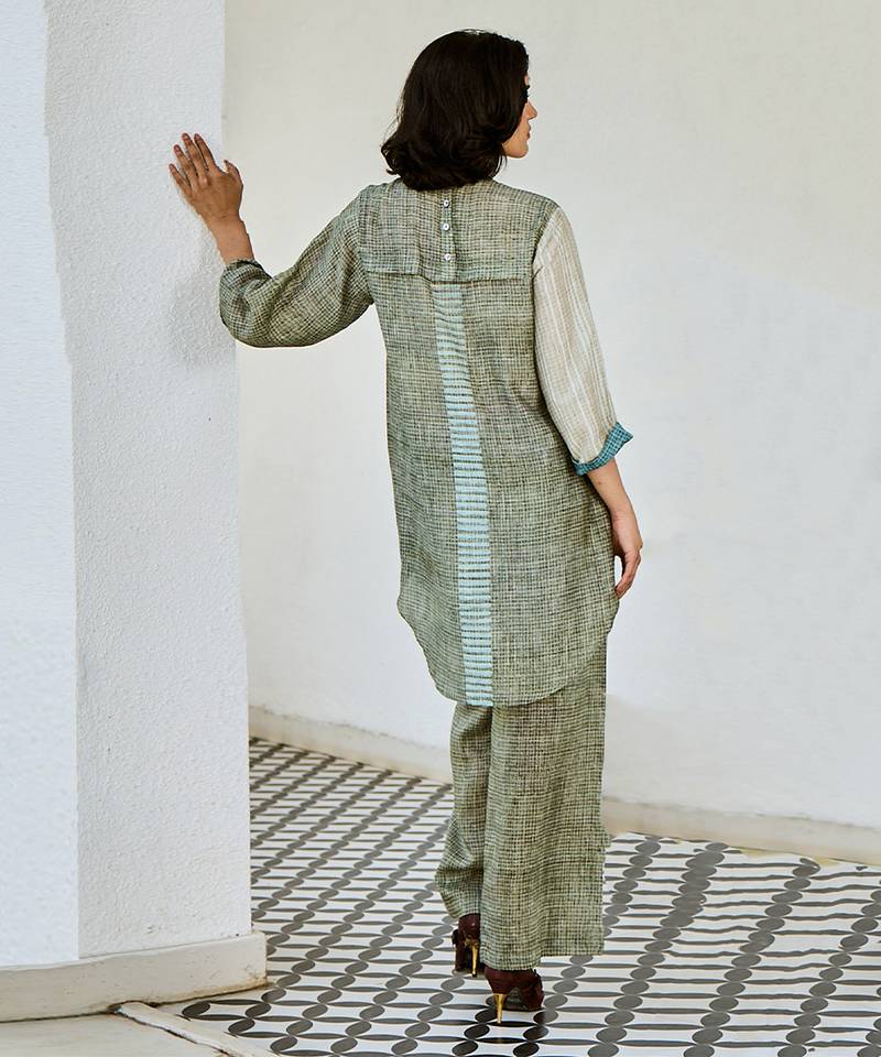 Grey blue printed linen kurta set