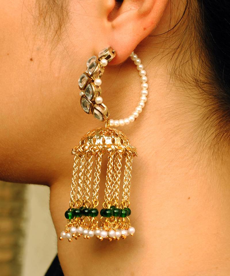 | Product Description | Traditional Gets Infused With Modernity When It Gets A New Form, Same Goes For This Pretty Jhumki Ornamented With Dangling Chains And Emerald Colored Beads Connected To A Decorated Kundan Hoop. |