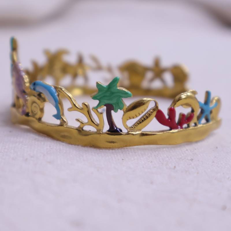 | Product Description | Women’s Gold Plated Tropical Theme Open Bangle | Shell, Starfish & Palm Tree Design Stainless Steel Bracelet |