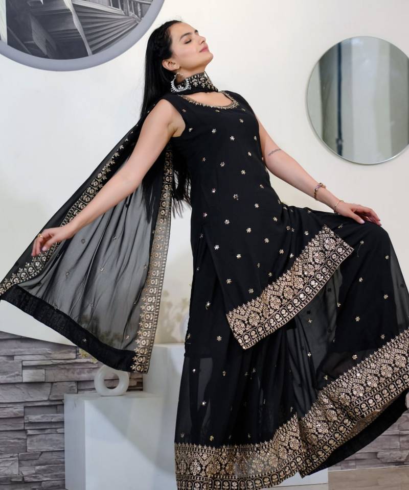 Black festive wear designer fox georgette heavy embroidery sequence work readymade suit stitched