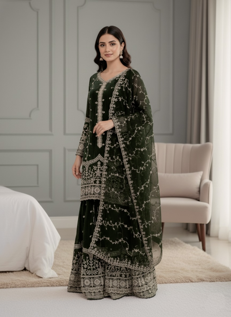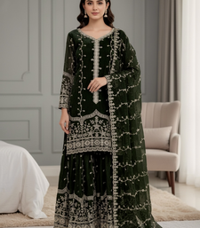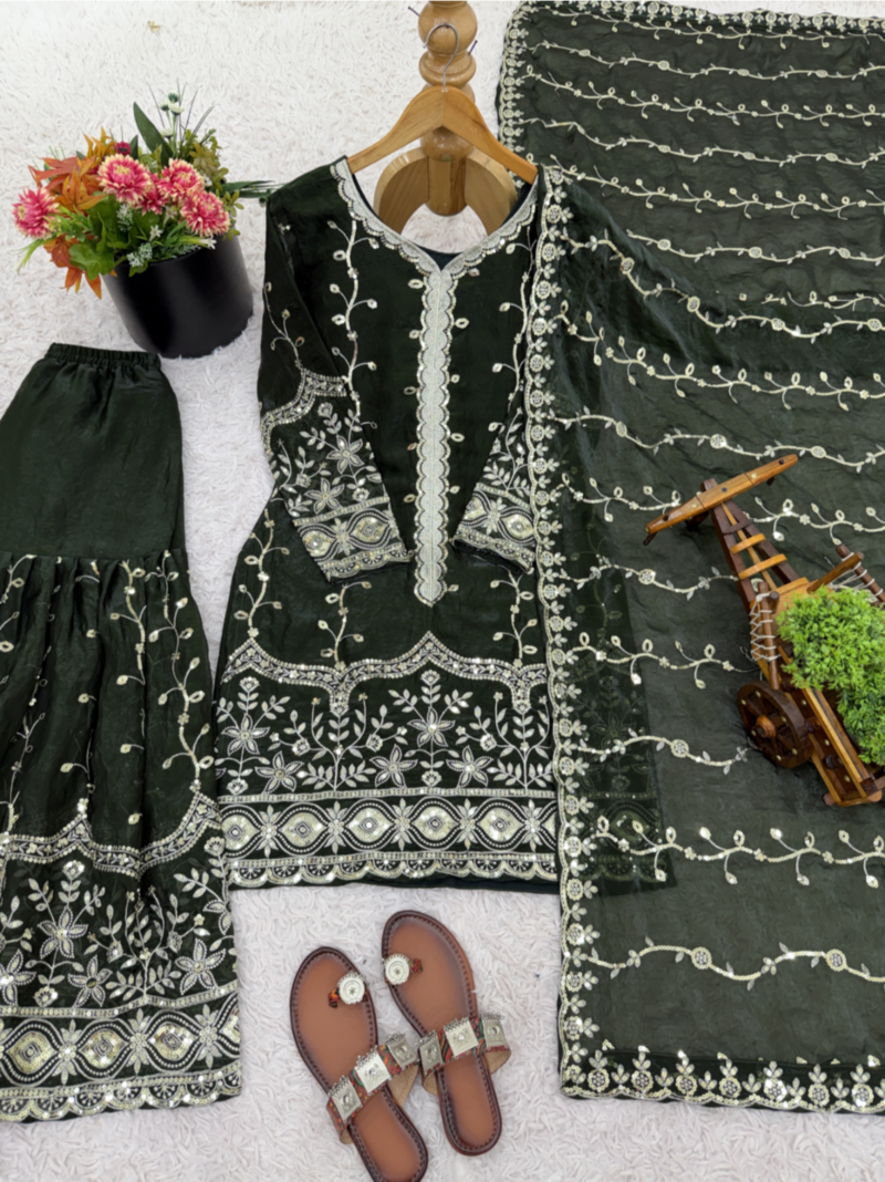 Green festive wear designer pure fendy silk sequence work readmade suit stitched