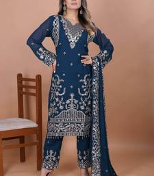 Blue festive wear designer fox georgette coding sequence embroidery work with ready made lace border readymade suit