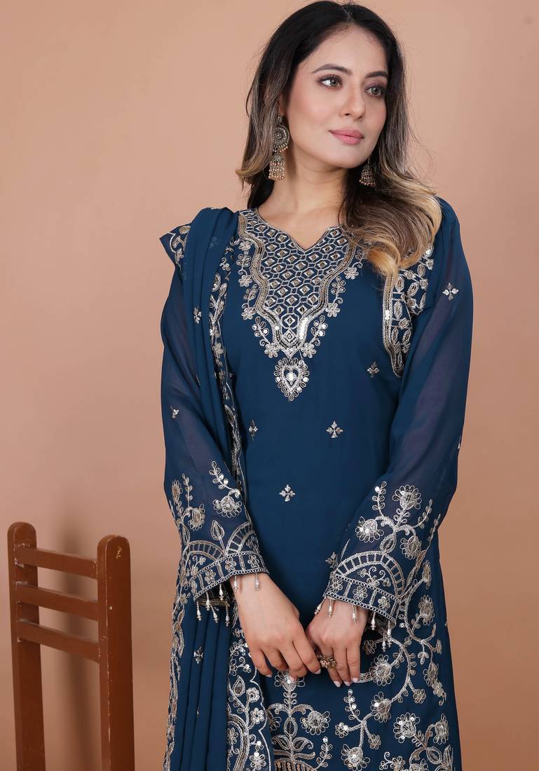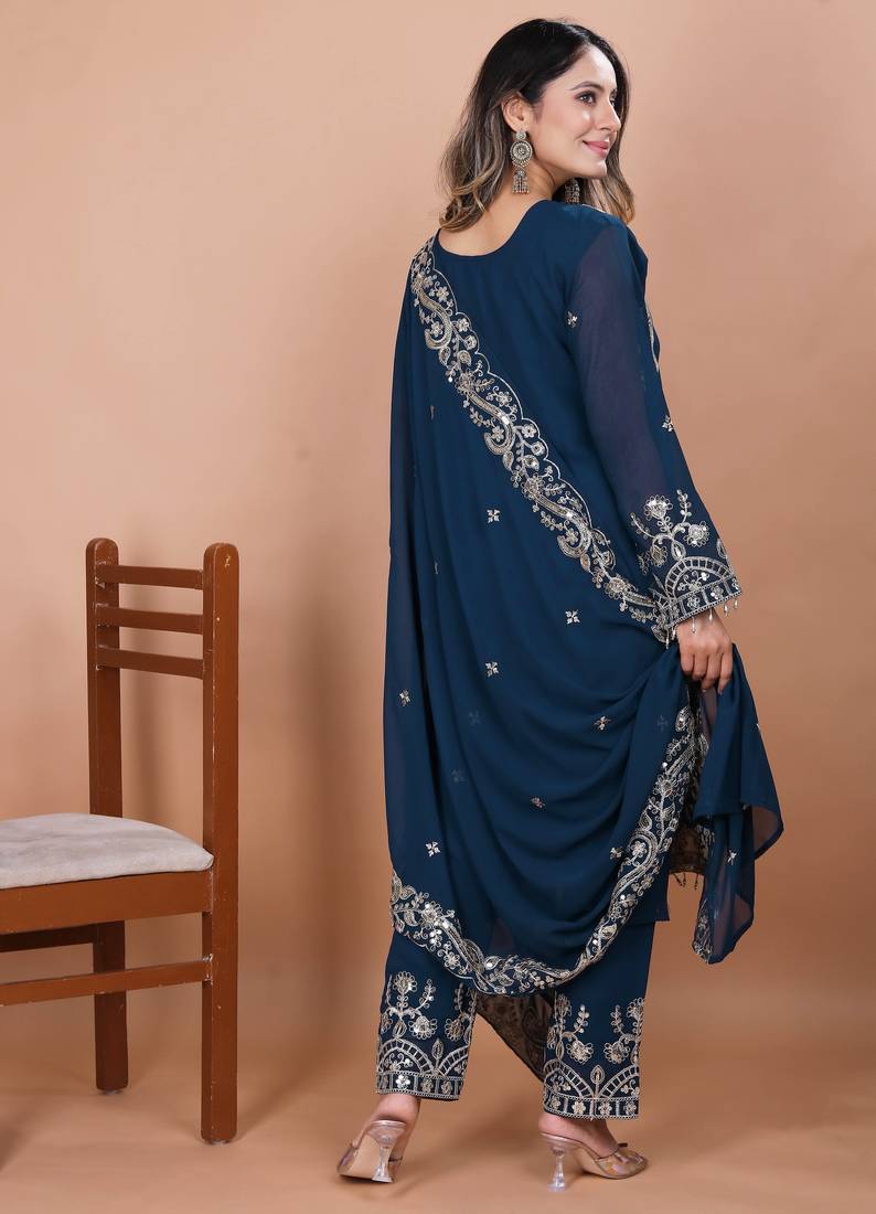 Product Name Blue Festive Wear Designer Fox Georgette Coding Sequence Embroidery Work With Ready Made Lace Border Readymade Suit