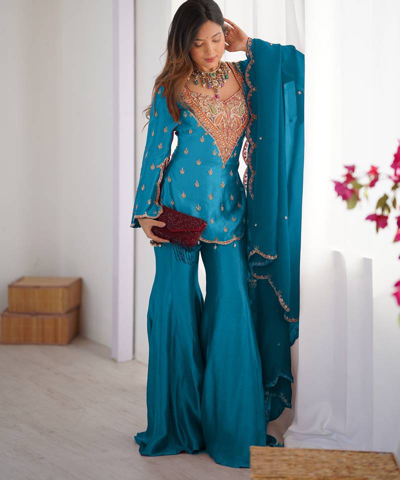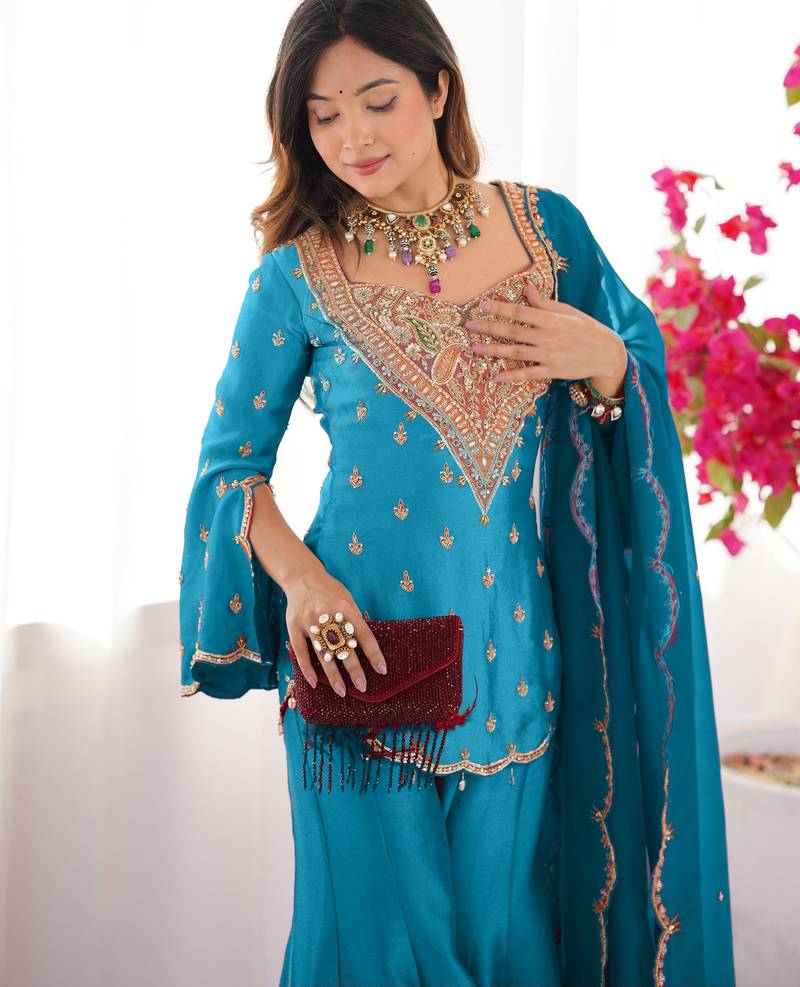 Blue festive wear designer heavy simar silk embroidery work readymade suit stitched