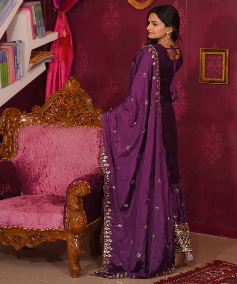| • | Dupatta | : | Color- Purple / Fabric- Fancy Fabric |