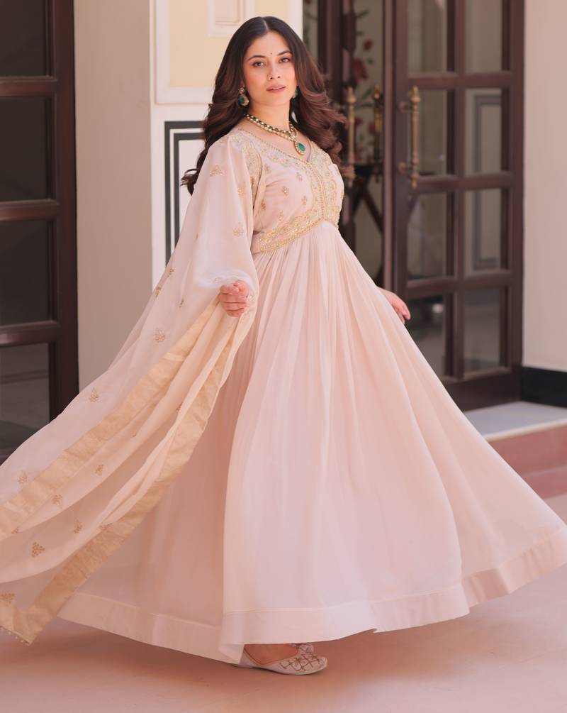 Cream festive wear designer star georgette sequence multi embroidered work readymade suit stitched