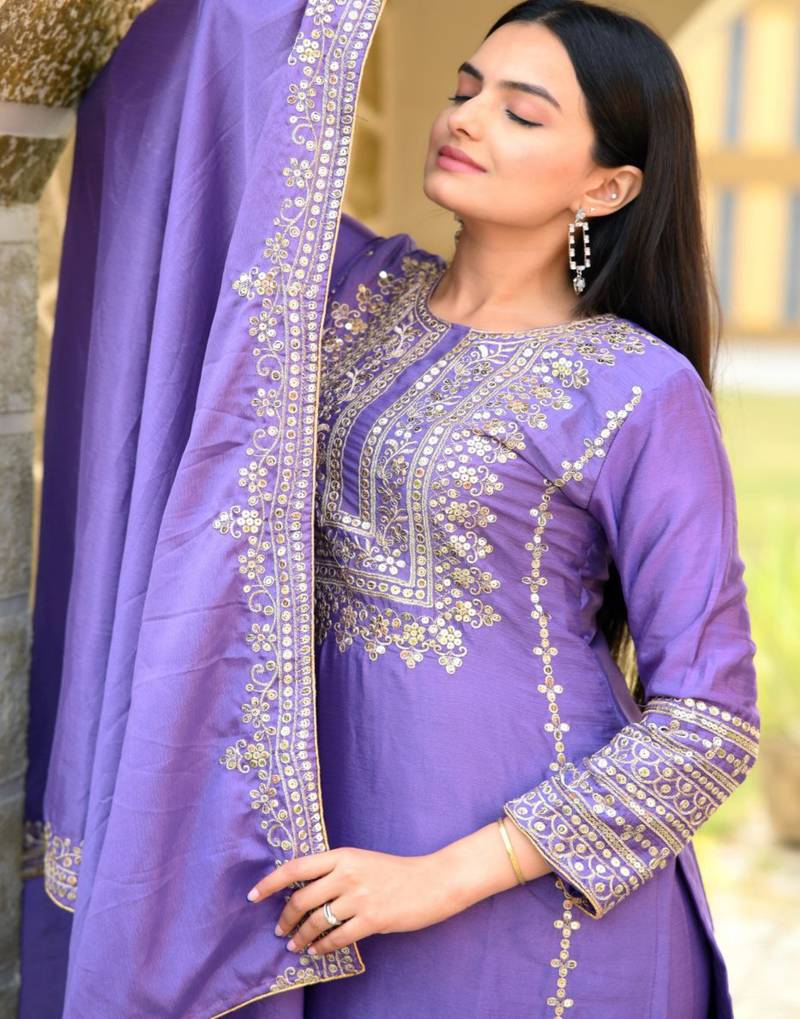 Lavender festive wear designer chinon heavy embroidery sequence work readymade suit stitched