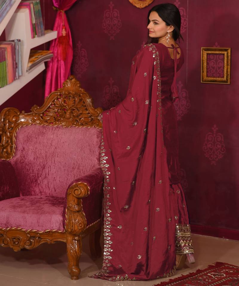 Maroon festive wear designer chinon sequence embroidery work readymade suit stitched