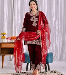 Maroon festive wear designer pure heavy viscose velvet embroidery coding sequence work readymade suit stitched