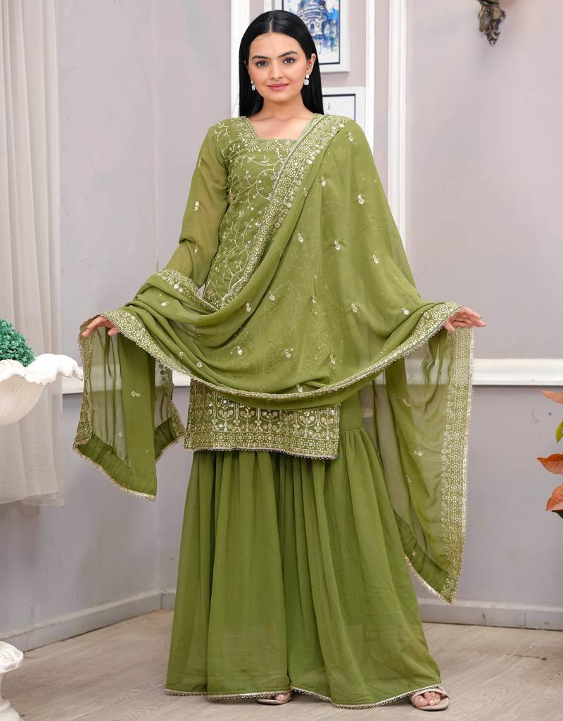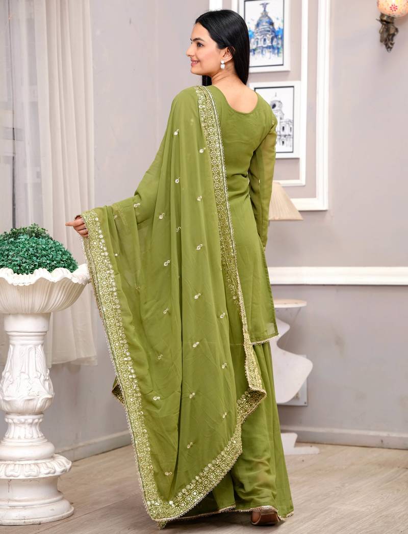 | Product Name | Mehendi Green Festive Wear Designer Fox Georgette Sequence Embroidery Work Readymade Suit | |
