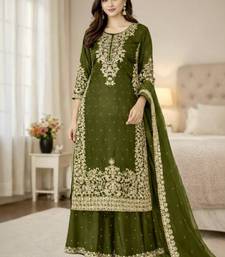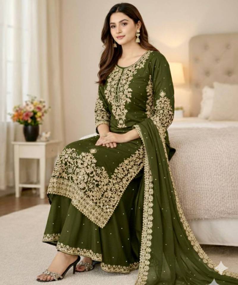 Mehendi green festive wear designer pure gmy silk embroidery coding sequence work with moti work readymade suit