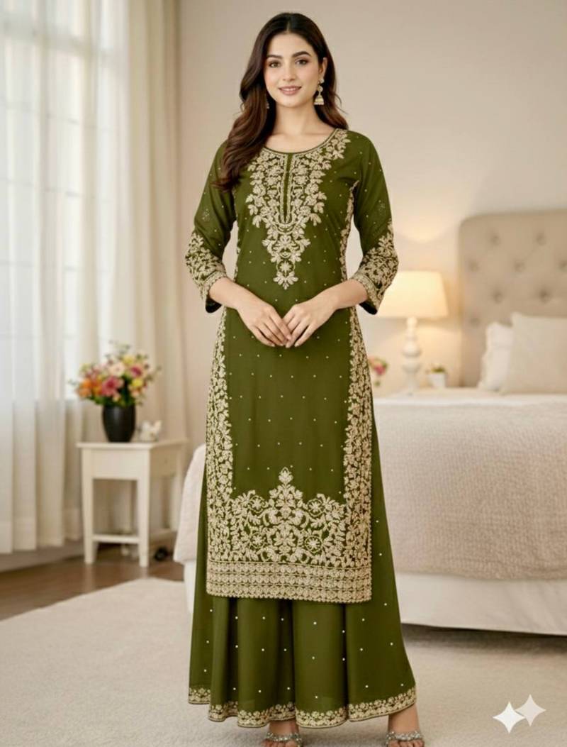 Mehendi green festive wear designer pure gmy silk embroidery coding sequence work with moti work readymade suit stitched