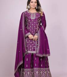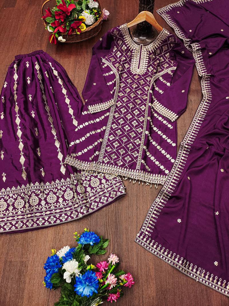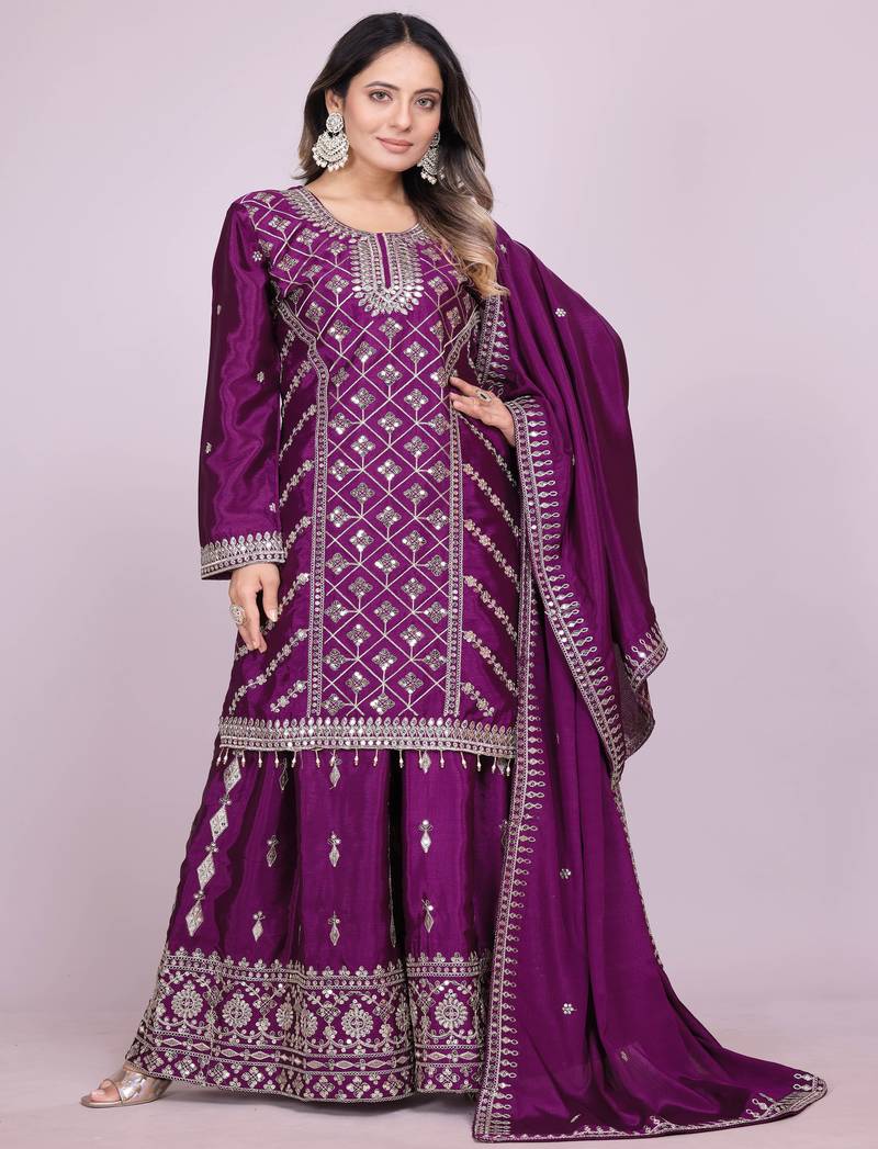 Purple festive wear designer chinon coding sequence embroidery work readymade suit stitched