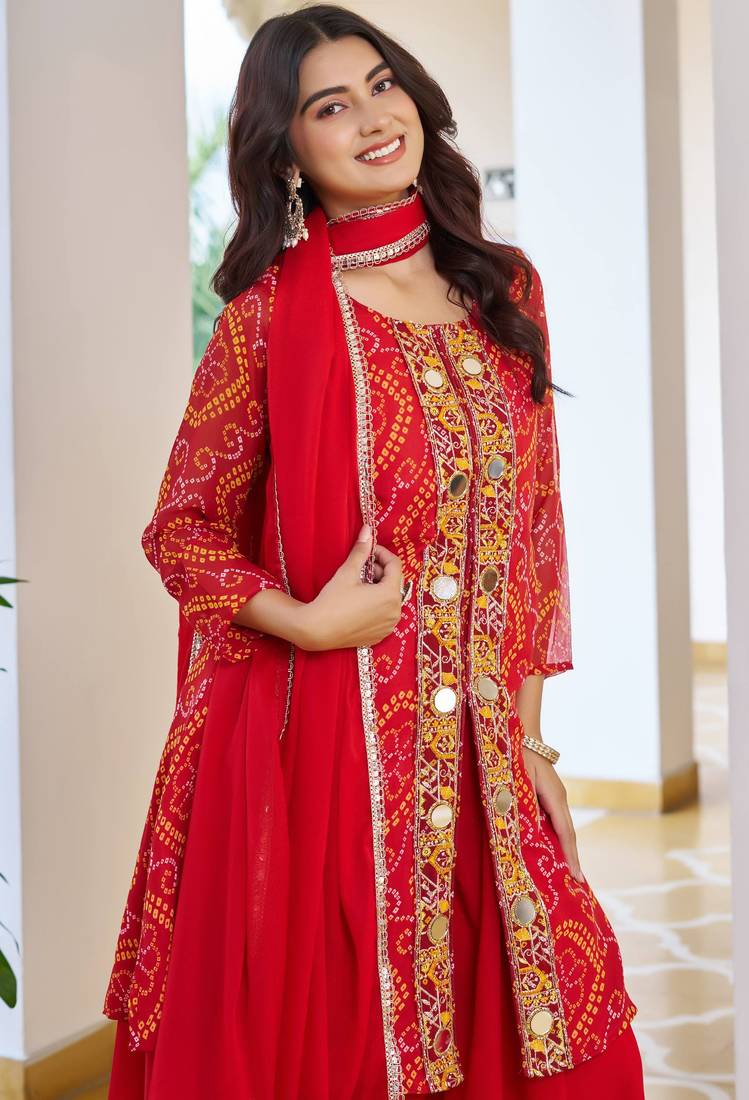 | Product Name | Red Festive Wear Designer Fox Georgette Mirror With Thread With Bids Look Embroidery Work Readymade Suit | |