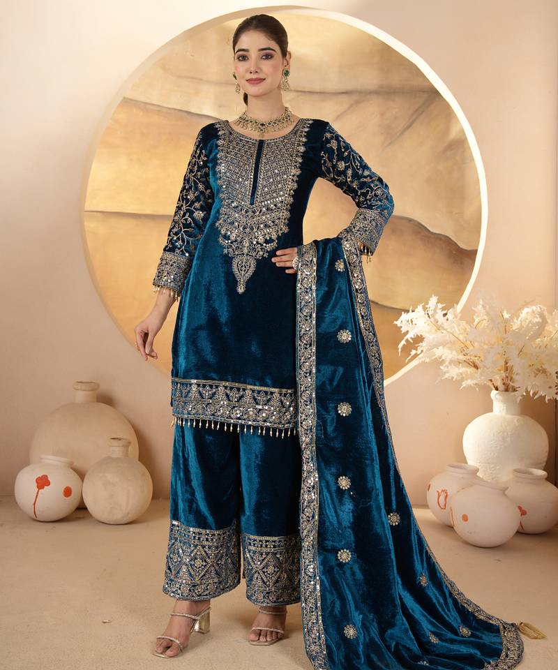 Teal festive wear designer pure heavy viscose velvet heavy embroidery coding sequence work readymade suit stitched