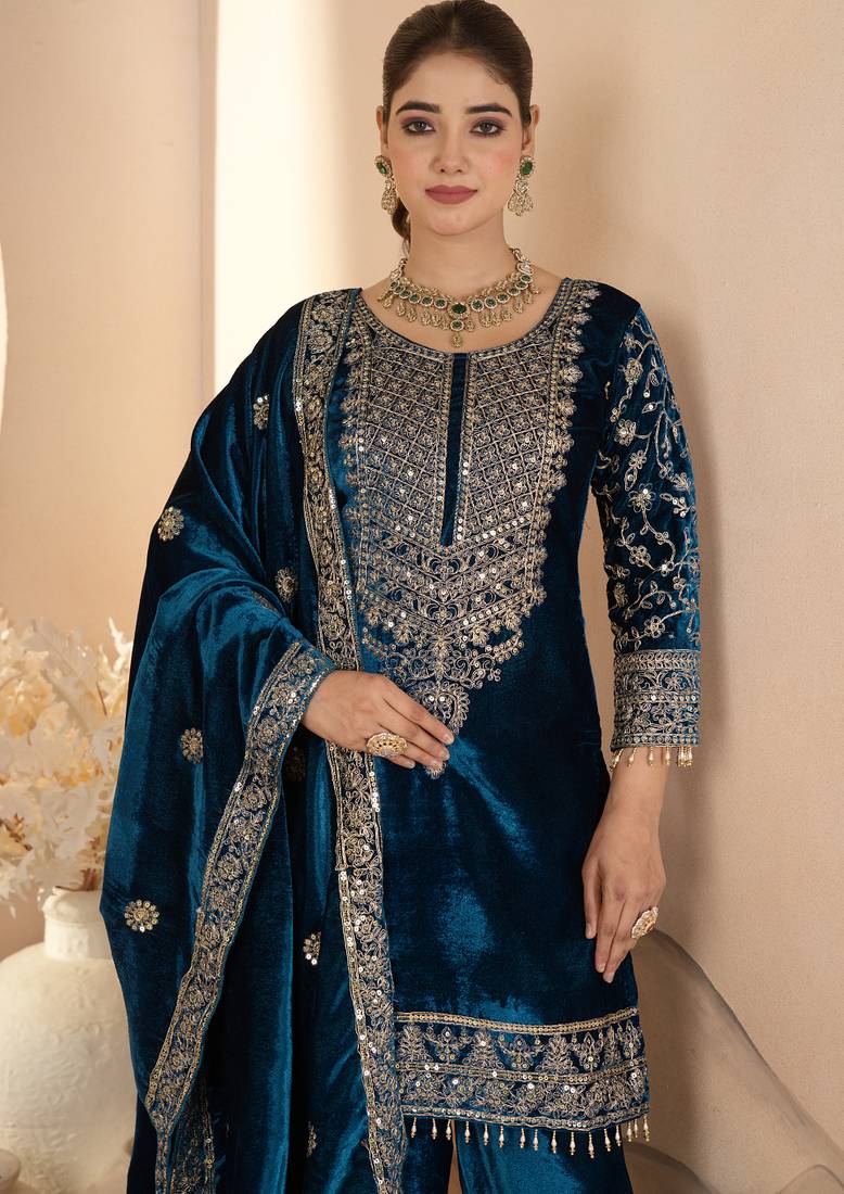 | Product Name | Teal Festive Wear Designer Pure Heavy Viscose Velvet Heavy Embroidery Coding Sequence Work Readymade Suit | |