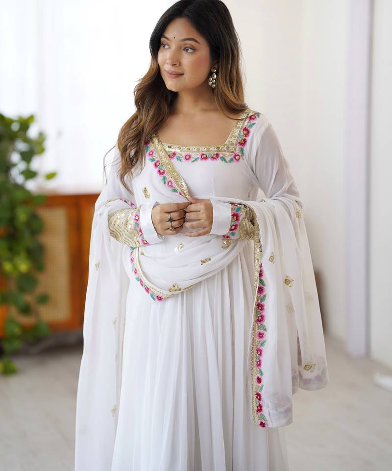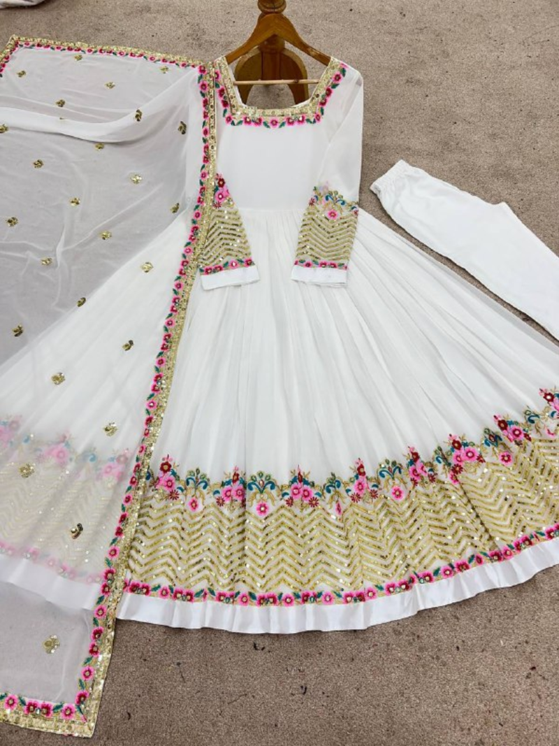 White festive wear designer heavy georgette heavy multi thread embroidery sequence work readymade suit stitched