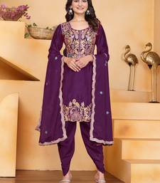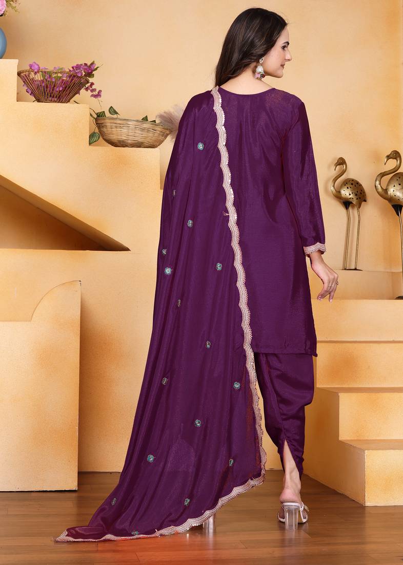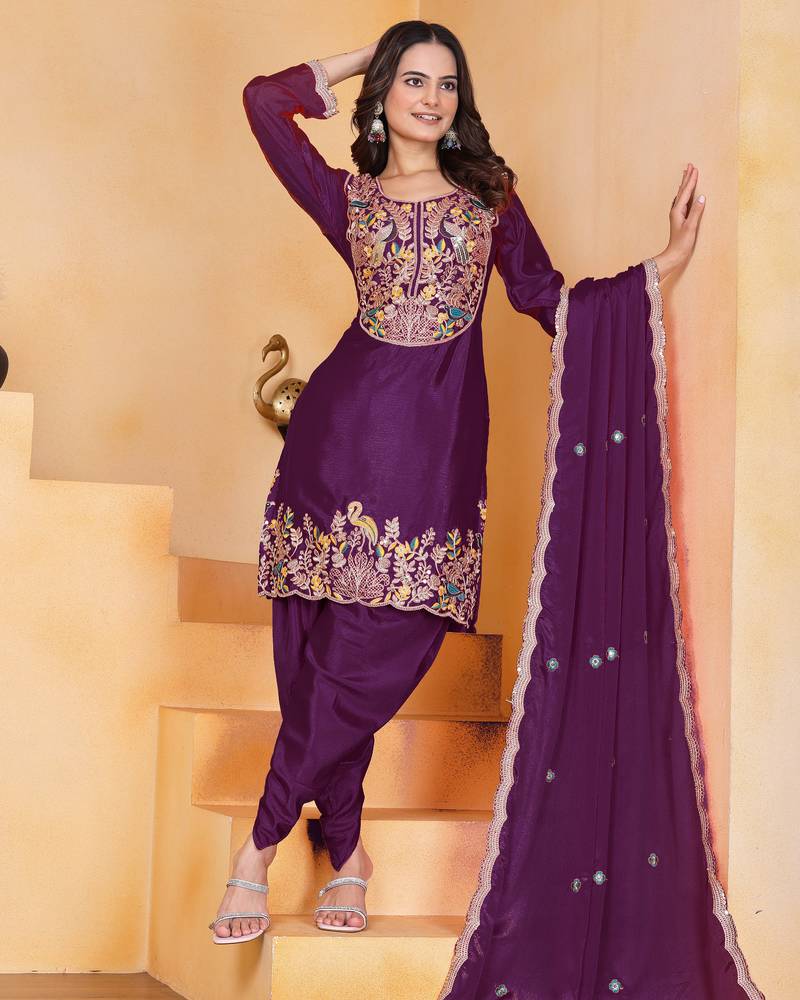 Wine festive wear designer chinon coding sequence embroidery work readymade suit stitched