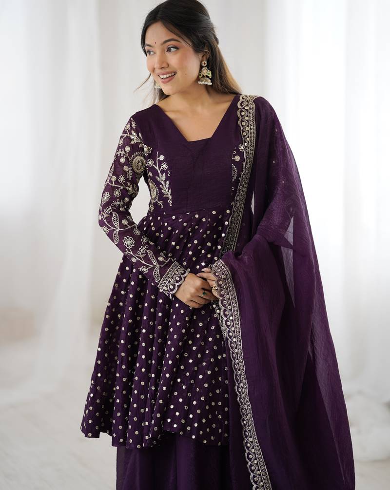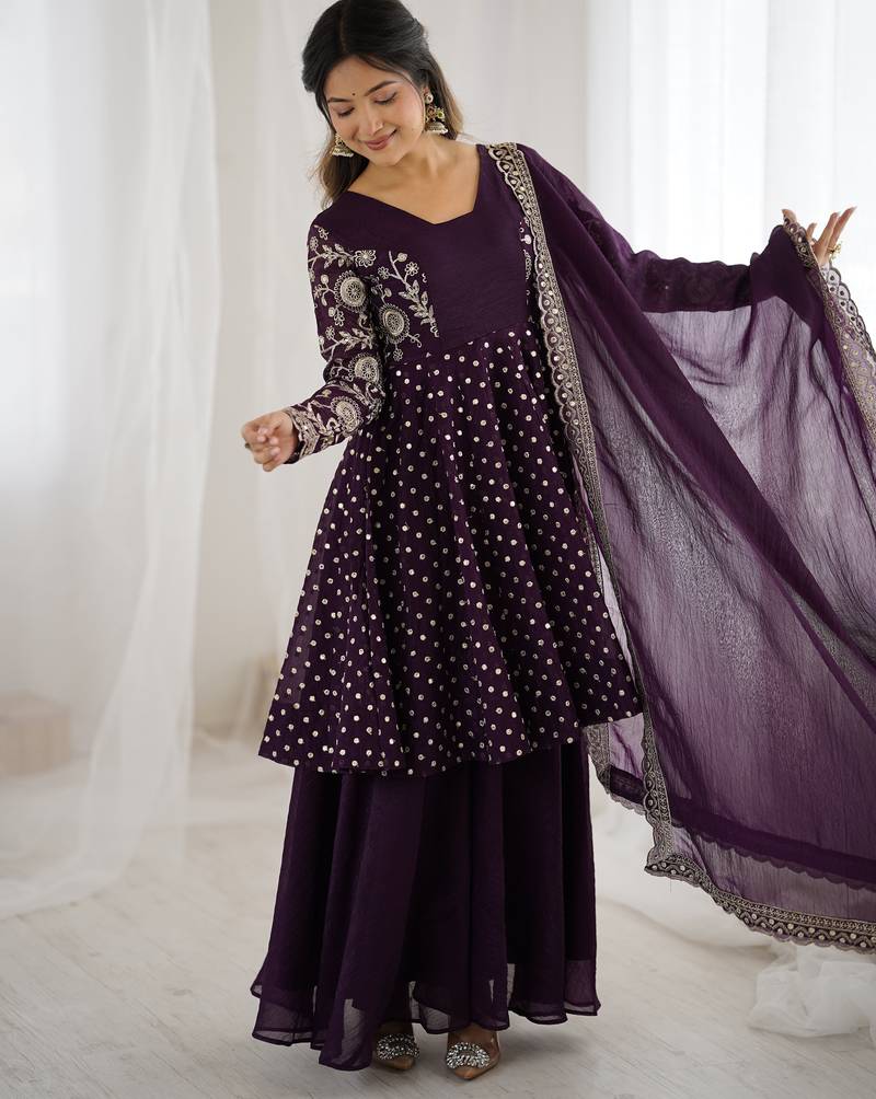 Wine festive wear designer crunchy silk embroidery sequence work readymade suit stitched