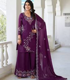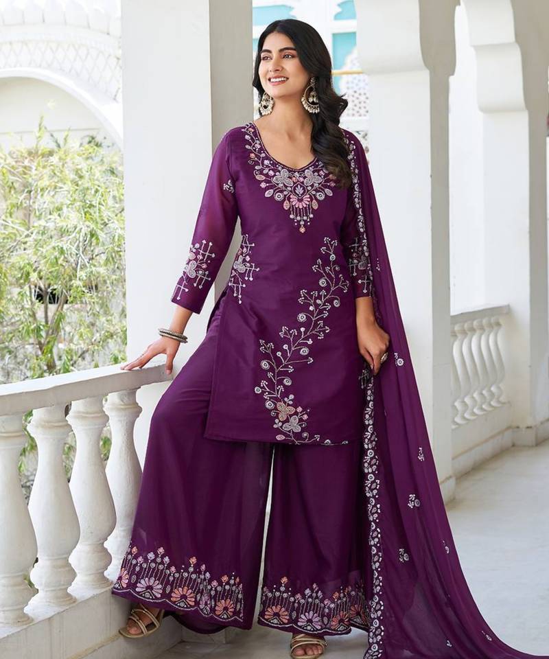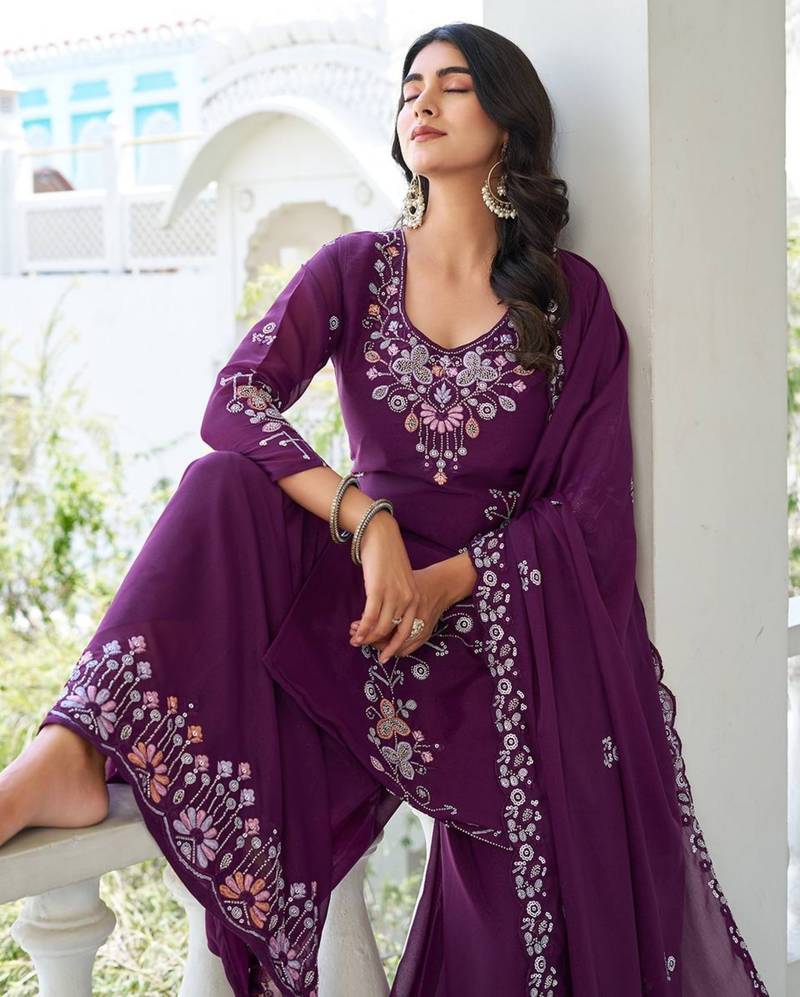 Wine festive wear designer star georgette sequence embroidery work readymade suit stitched