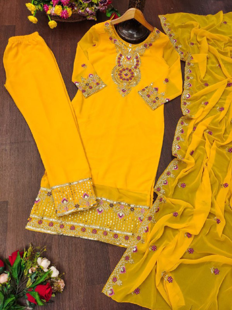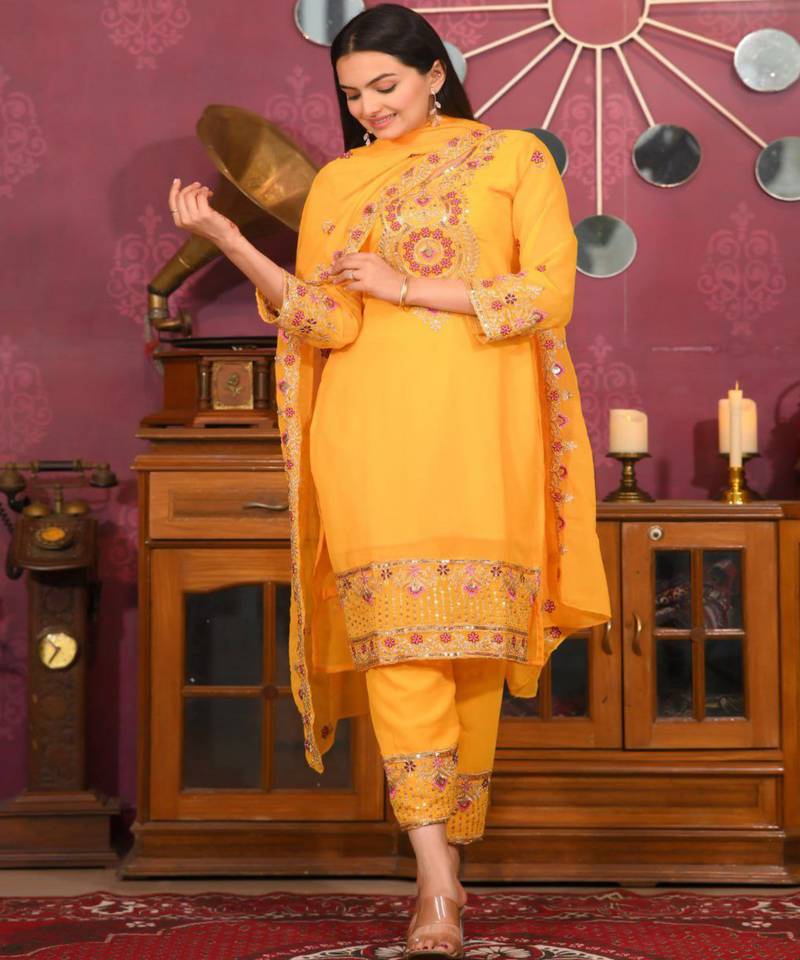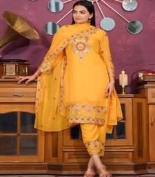 Yellow festive wear designer fox georgette heavy embroidery sequence work readymade suit stitched
