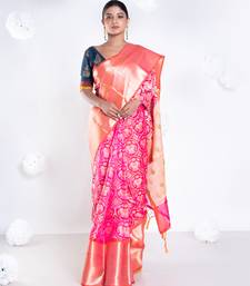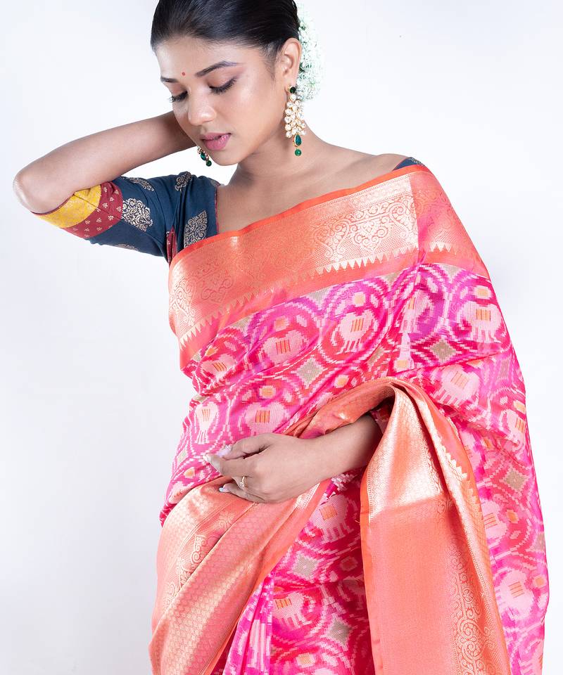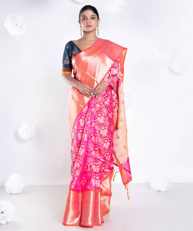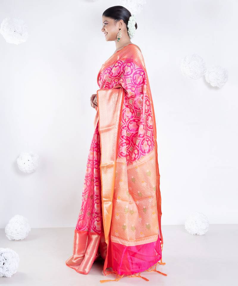 Banarasi kora cotton in sunset pink saree with patola elephant motis and contrasting border