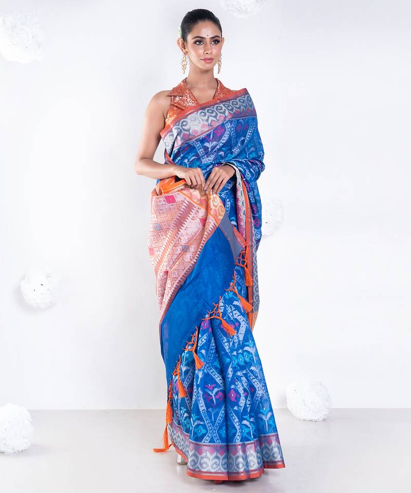 Varanasi chanderi saree in blue color with tree motifs and golden border