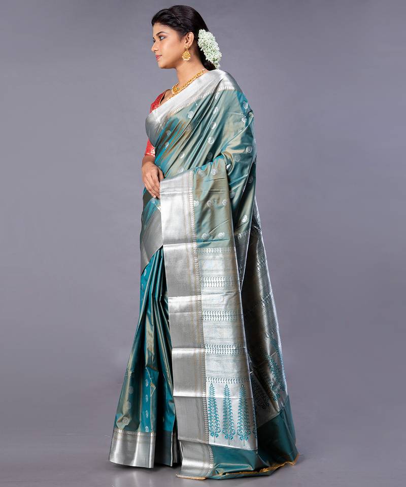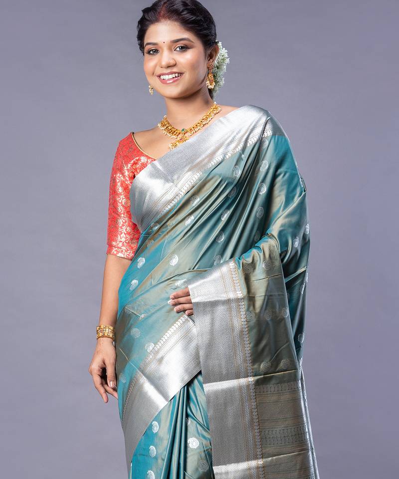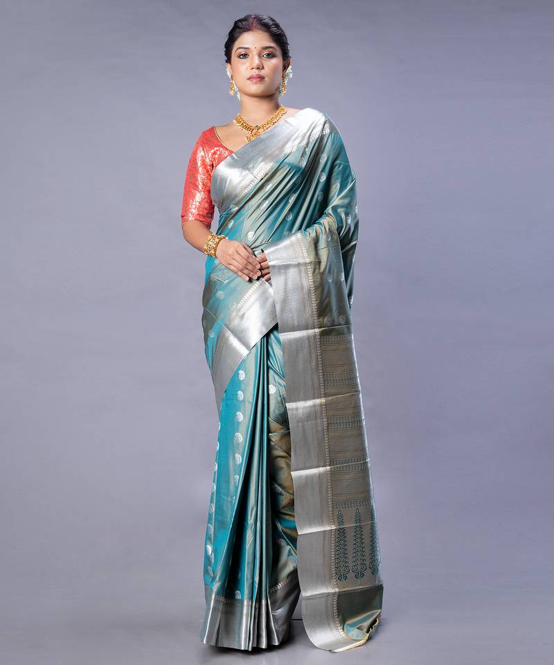 | Product Name | Kanjivaram Saree In Blue Color With Silver And Copper Zari Border | |