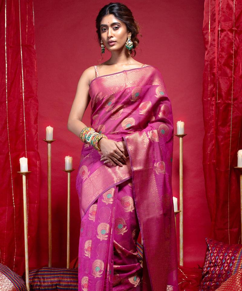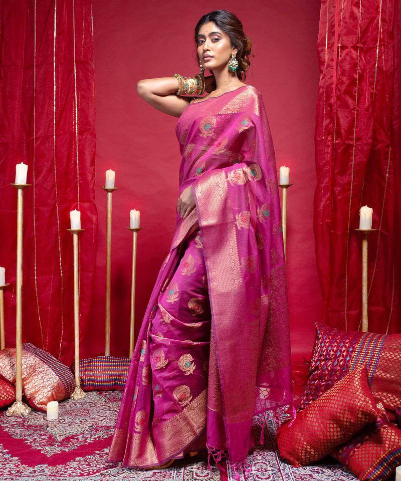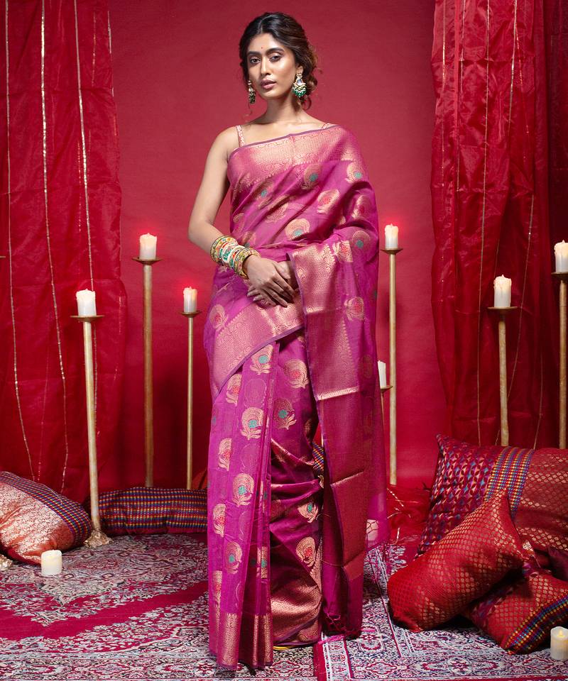 | Product Name | Banarasi Kora Organza Silk Saree In Magenta Color With Copper Zari Floral Motifs | |