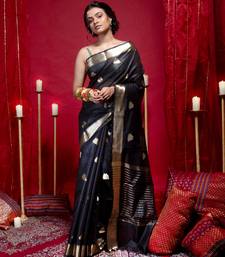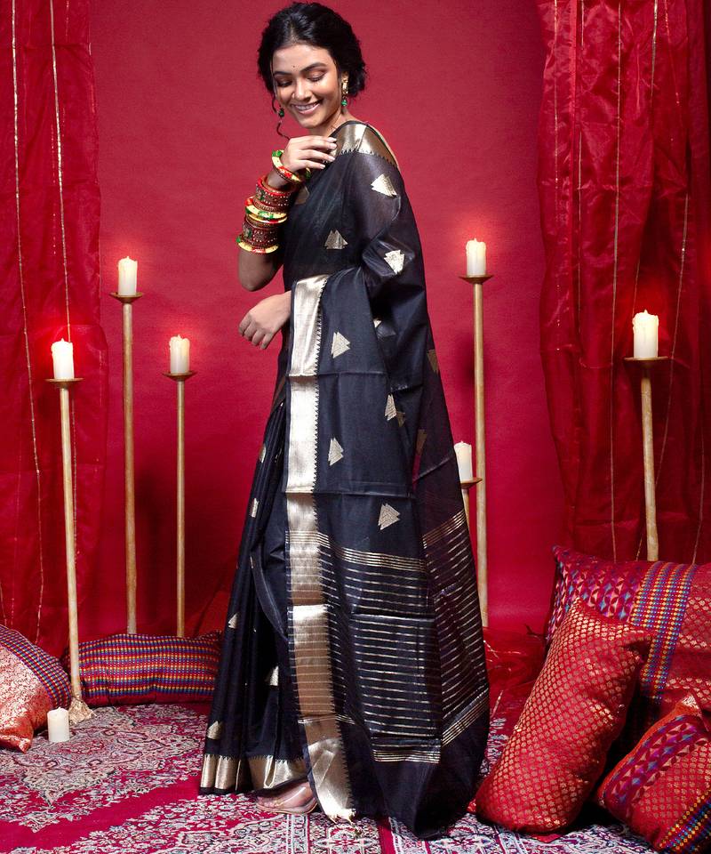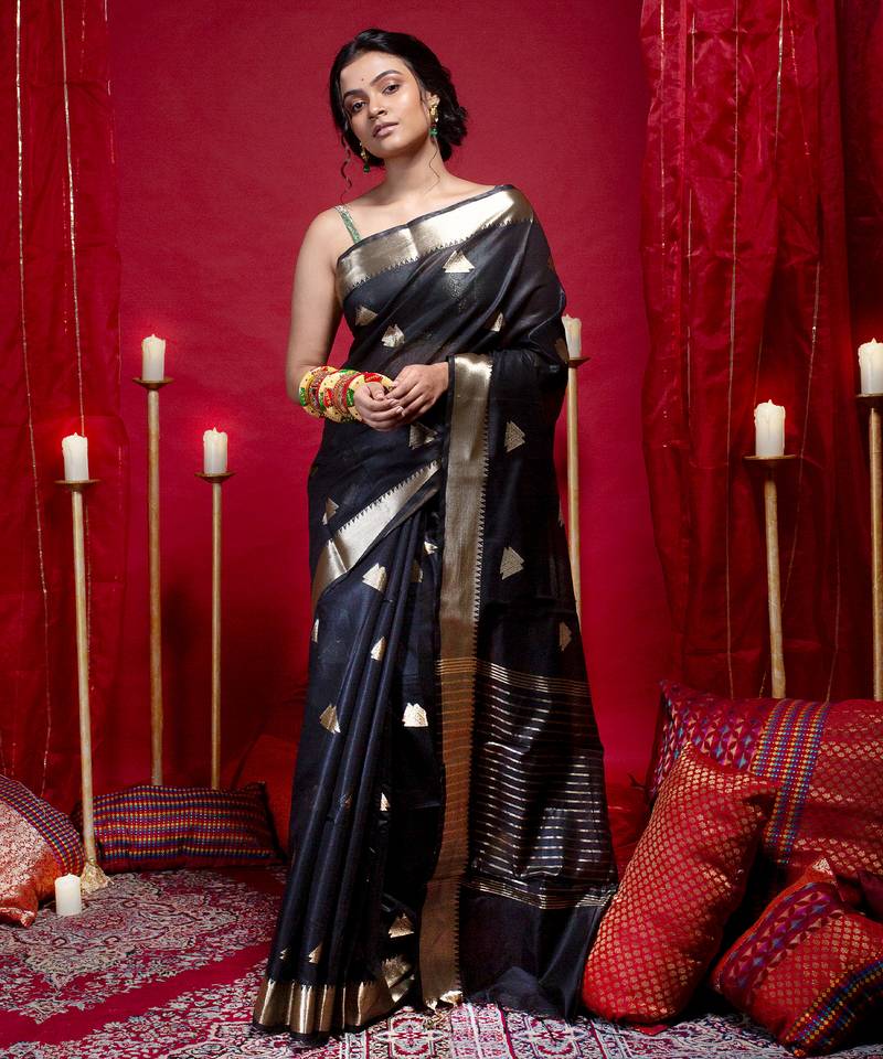 Banarasi kora organza saree in black color with triangle zari motifs and border