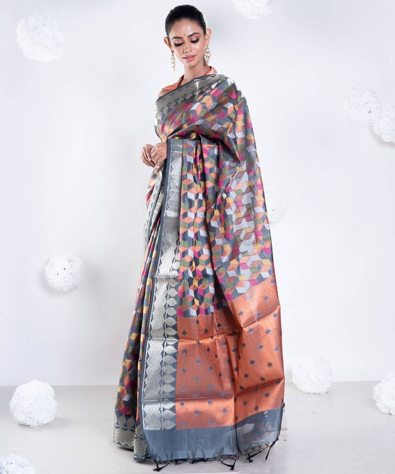 Banarasi kora organza saree in grey color with multicolor motifs with copper zari