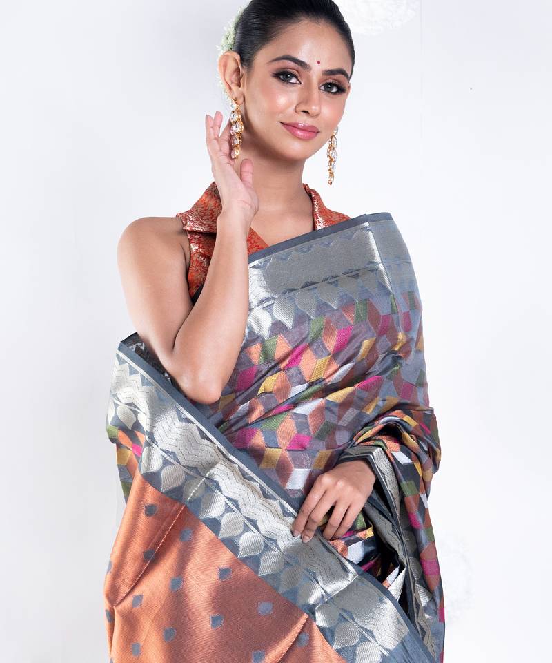 | Product Name | Banarasi Kora Organza Saree In Grey Color With Multicolor Motifs With Copper Zari | |