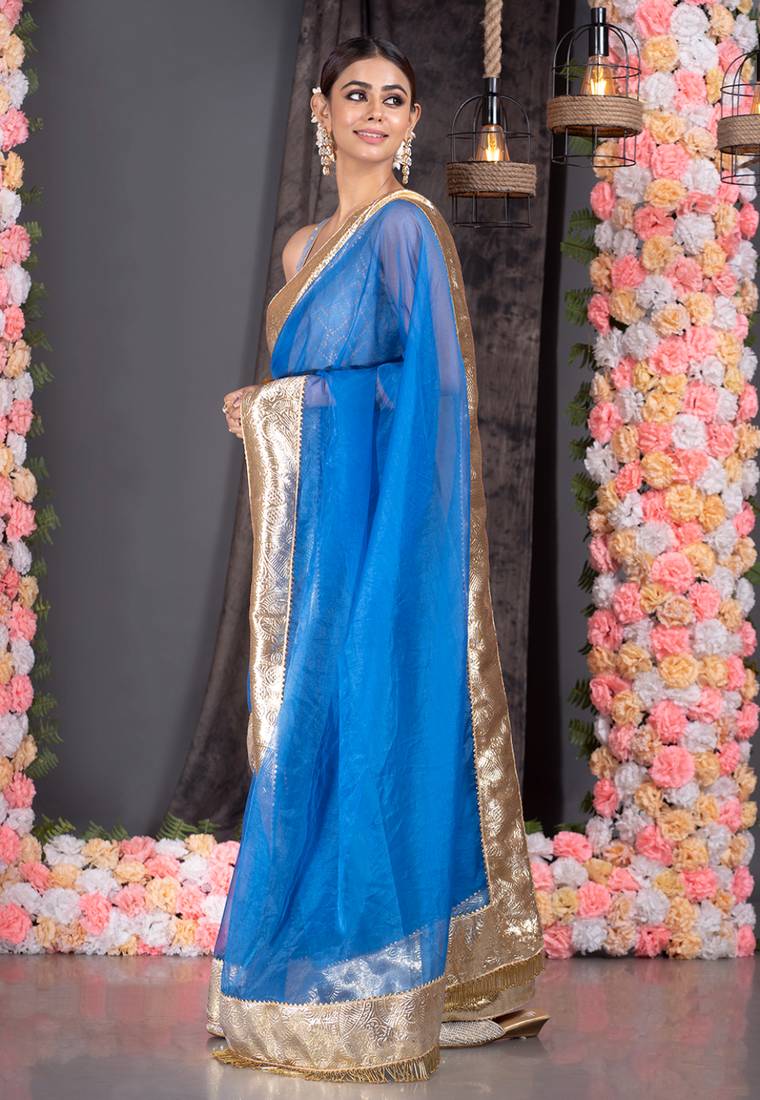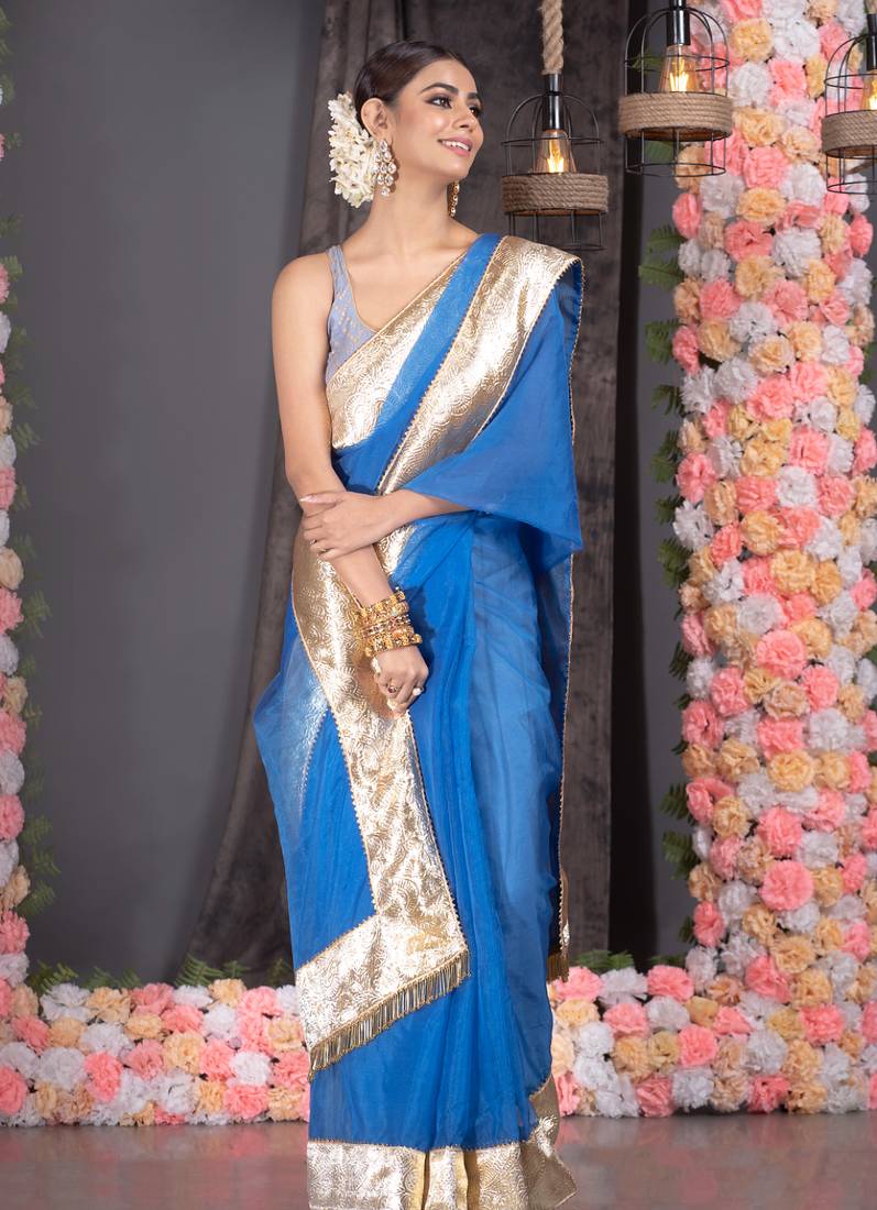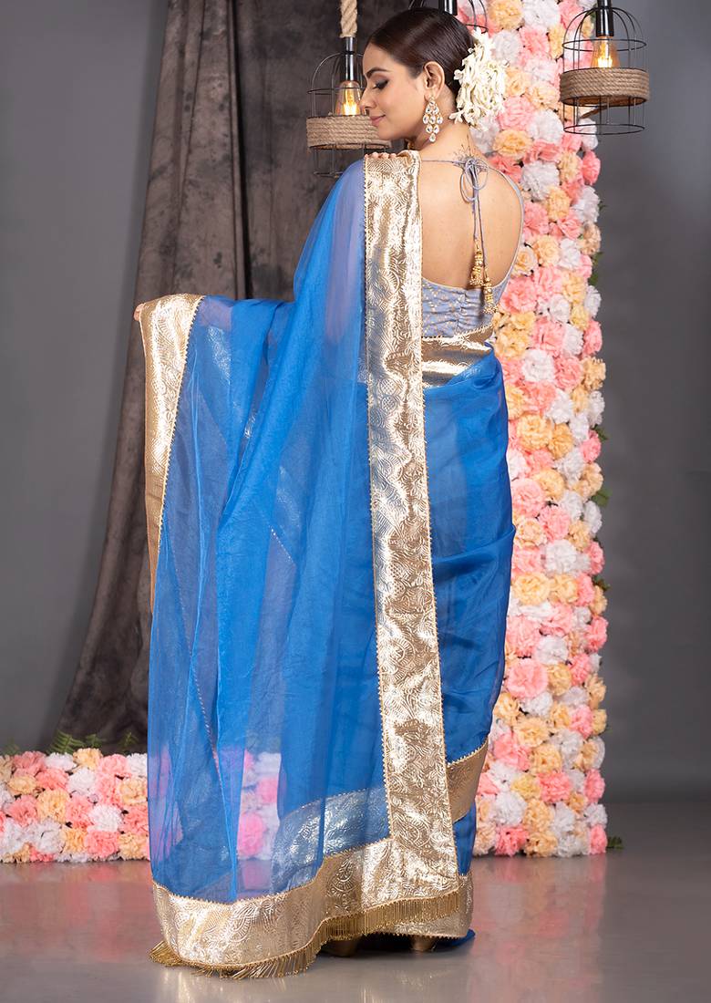 | Product Name | Royal Blue Organza Saree With Gold Gota Border And Fringe Lace | |