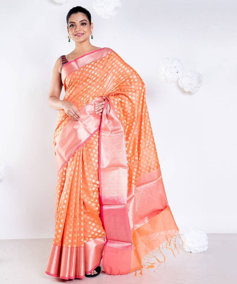 | Product Name | Banarasi Kora Organza Saree In Sunset Orange Color With Golden Border And Booti | |