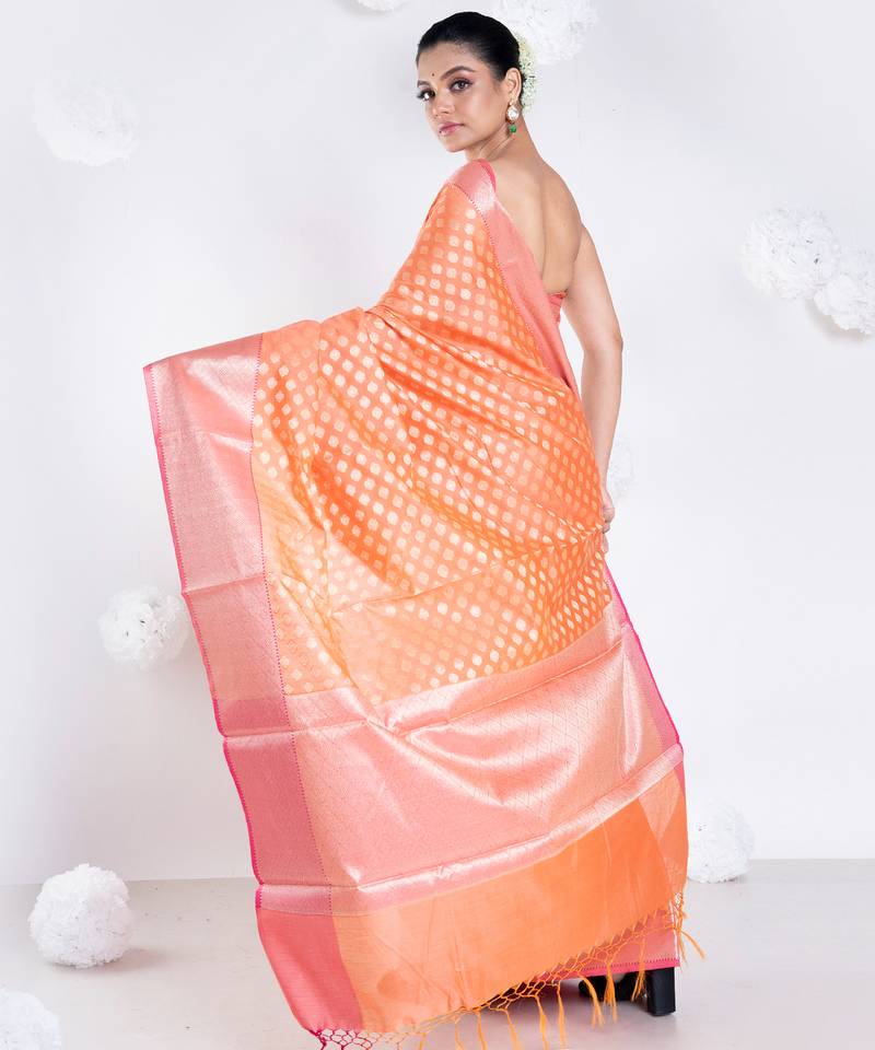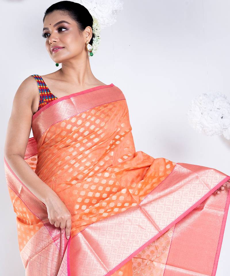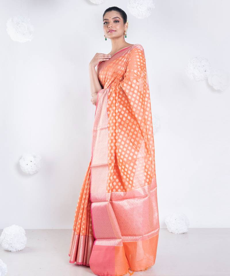 Banarasi kora organza saree in sunset orange color with golden border and booti