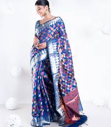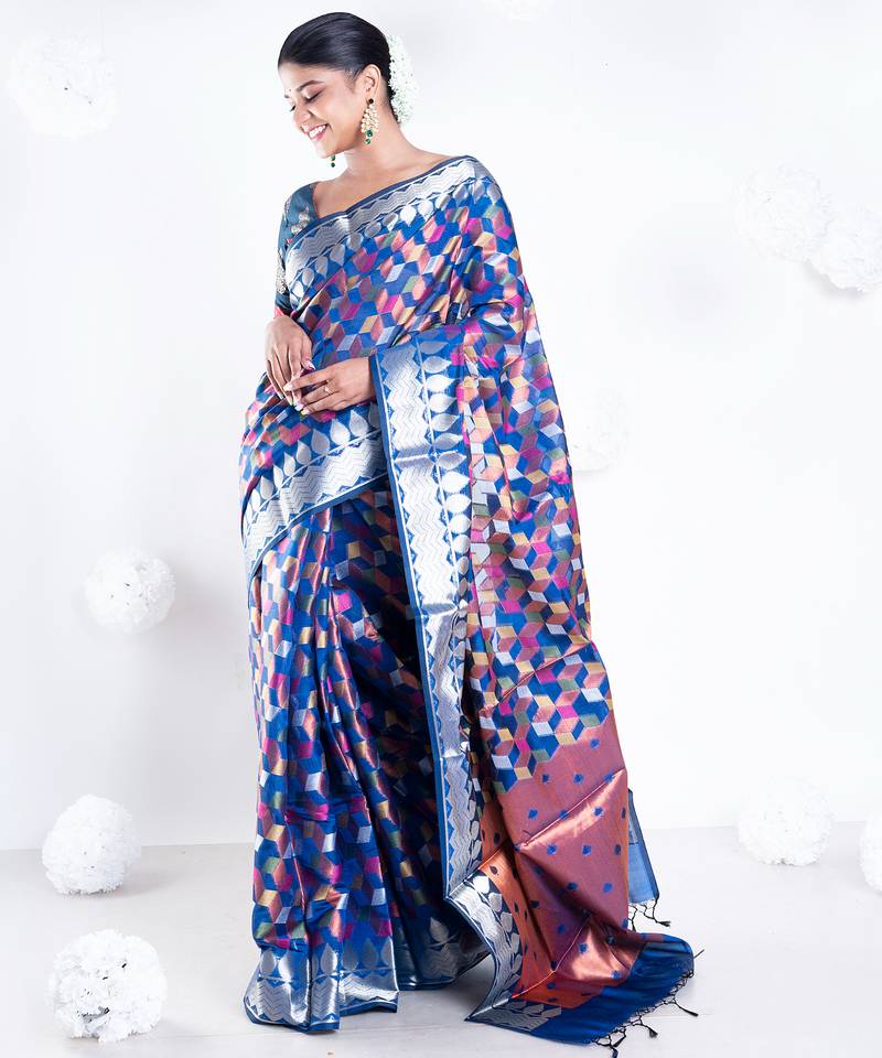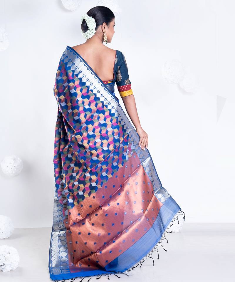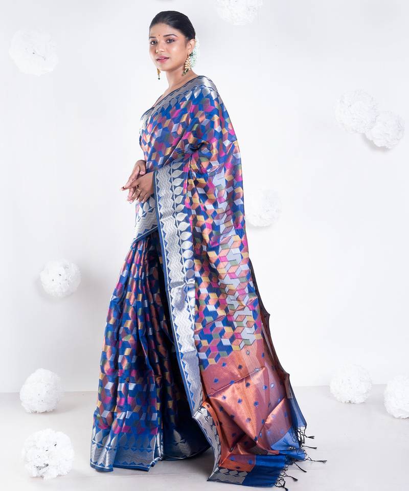 Banarasi kora organza saree in navy blue color with multicolor motifs with copper zari