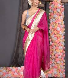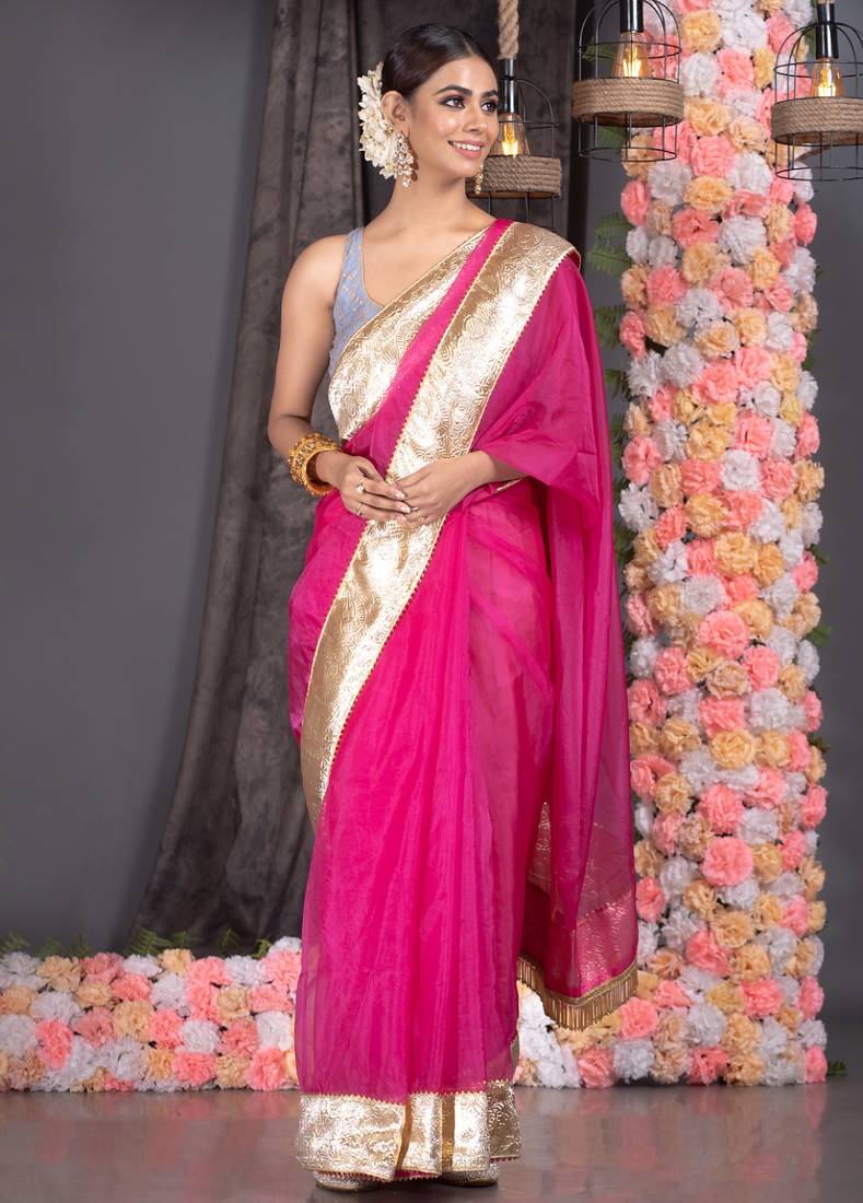 | Product Name | Hot Pink Organza Saree With Gold Gota Border And Fringe Lace | |