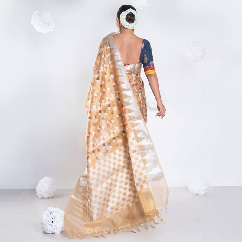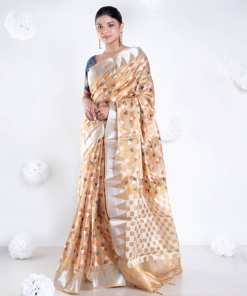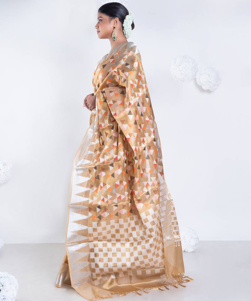 Banarasi kora organza saree in mud yellow color with multicolor motifs with copper zari