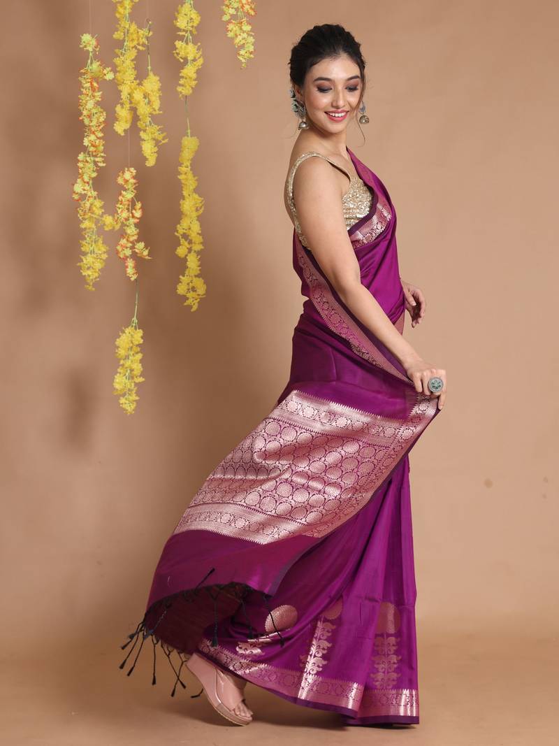 Purple silk handwoven saree with zari woven floral designs and motifs