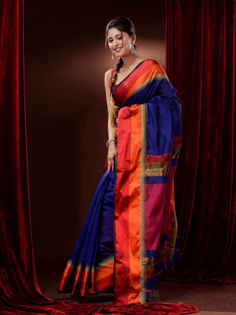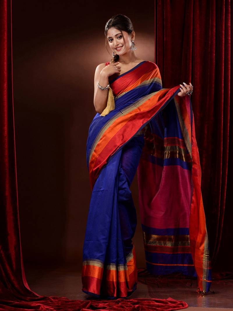 Royal blue cotton silk handwoven saree with contrast borders and pallu