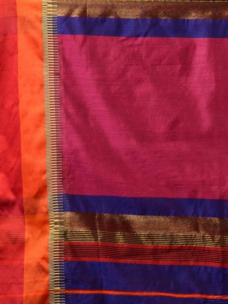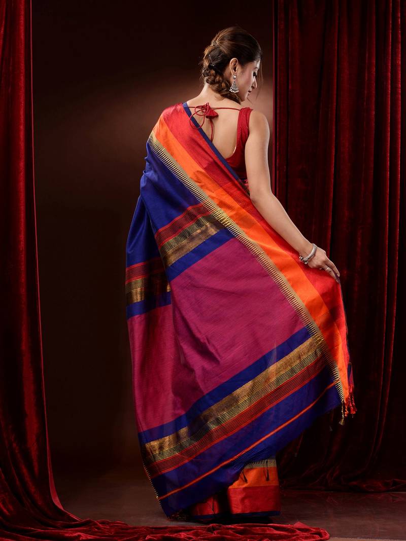 | Product Description | Bring Out The Brighter Side Of Your Personality In This Royal Blue Cotton Silk Handwoven Saree. It Has Dual Contrasting Borders In Red And Orange Along With Woven Patterns. The Magenta Pallu Compliments The Look Beautifully. |