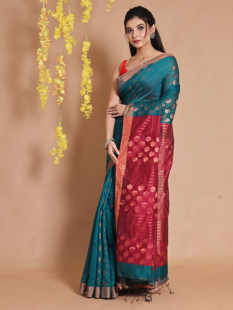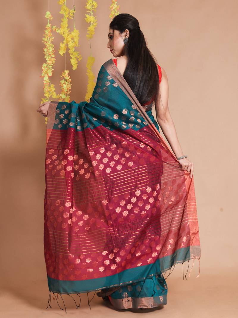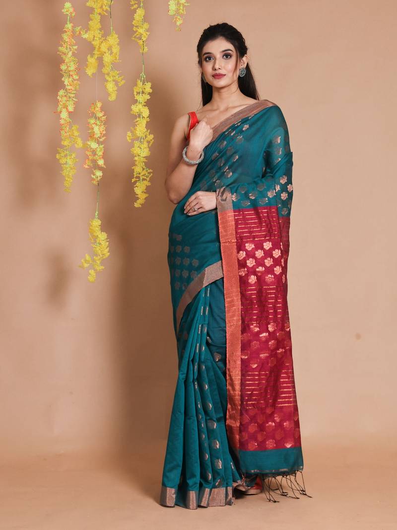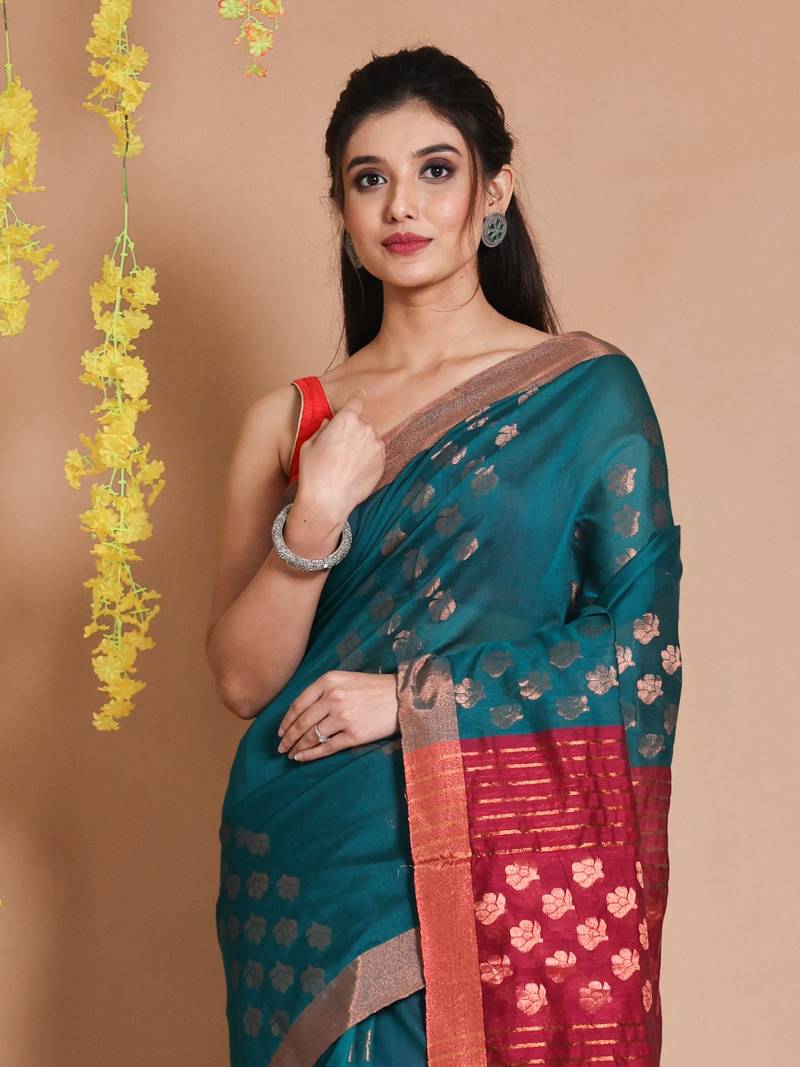 | Product Name | Teal Blended Cotton Handwoven Saree With Floral Zari Motifs And Striped Pallu | |