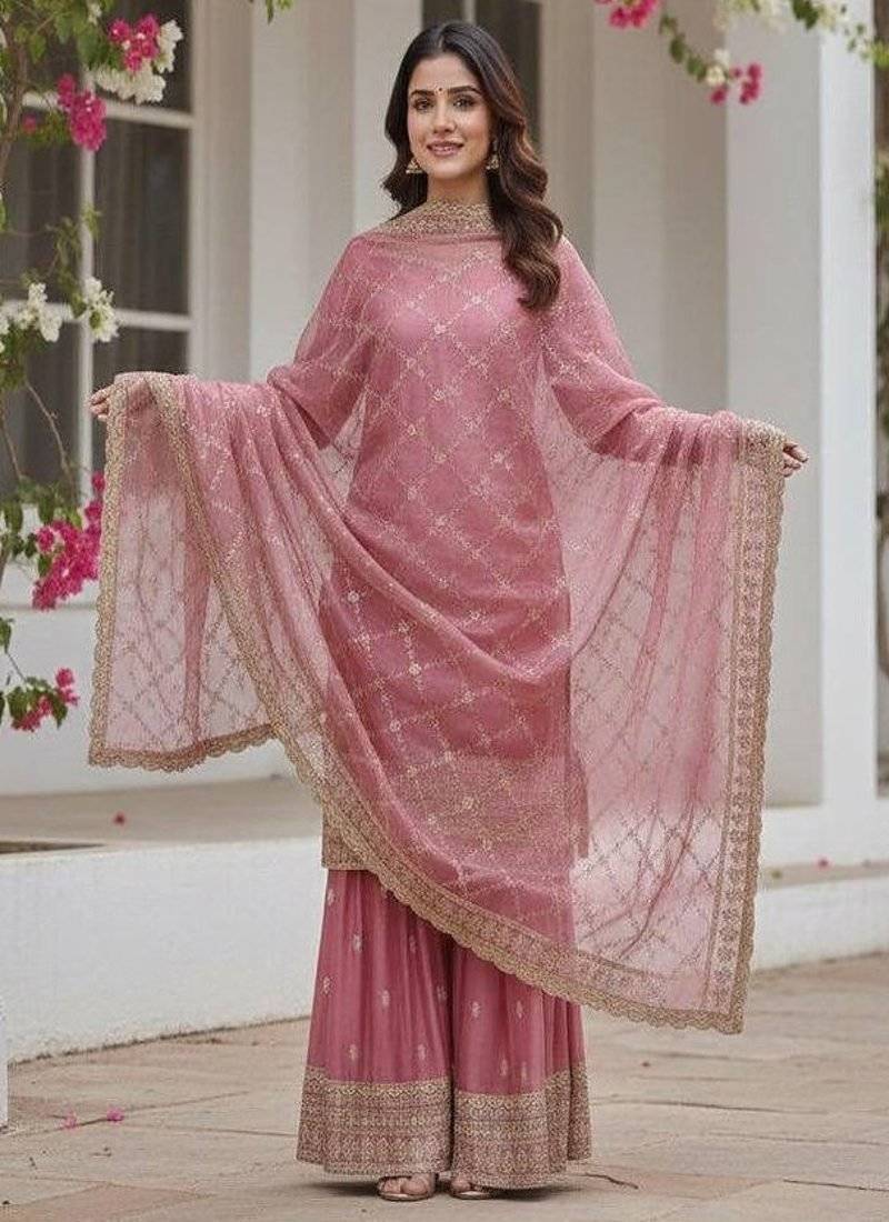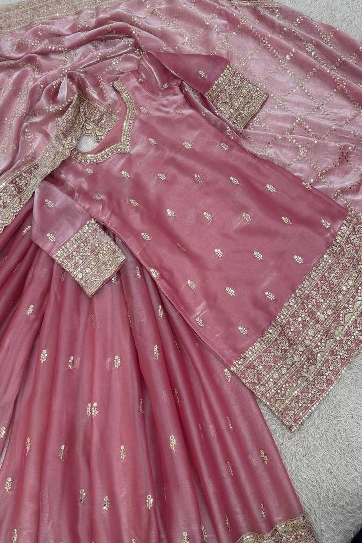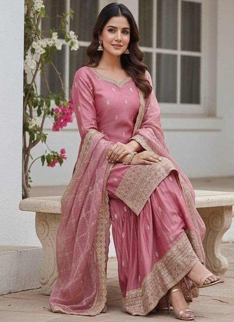 | Product Description | Soft And Romantic, This Blush Pink Sharara Suit Features Delicate Gold Embroidery Throughout. The Matching Heavily Bordered Net Dupatta Adds Regal Charm. Designed For Weddings, Engagement Ceremonies, And Festive Celebrations, This Ensemble Blends Grace, Tradition, And Modern Sophistication. |