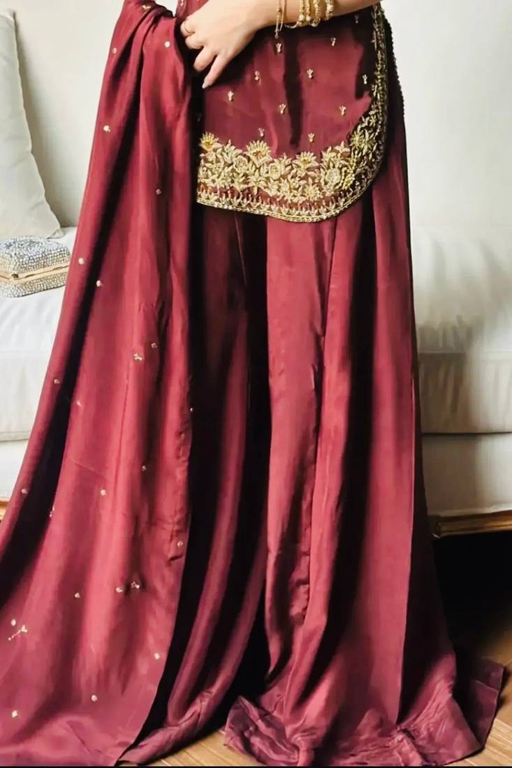 | Product Description | Experience Timeless Elegance With This Dark Maroon Crepe Palazzo Set. The Unique Curved Hemline Is Highlighted By Exquisite Gold Embroidery Work, Mirrored On The Sleeve Cuffs And Neckline. Complemented By A Flowing Palazzo With A Wide Embroidered Border, This Outfit Combines Comfort With High End Craftsmanship, Ideal For The Modern Minimalist. |