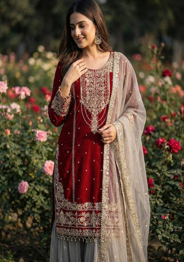 | Product Description | Radiate Regal Vibes In This Dark Maroon Faux Georgette Kurta Set. Featuring Opulent Gold Zardosi Embroidery And Shimmering Sequin Accents, The Rich Fabric Provides A Structured, Flattering Fit. Ideal For Celebrations Or Evening Galas, This Set Is Finished With A Sheer Scalloped Dupatta And Gray Flared Sharara, Merging Traditional Craftsmanship With Contemporary Style. |
