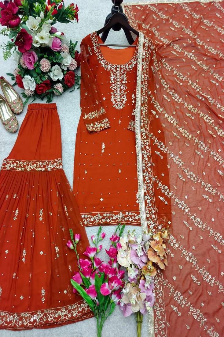 | Product Description | Capture Effortless Grace In This Dark Orange Sharara Suit. The Knee Length Tunic Is Accented With Delicate Embroidery And Sequins Work, Creating A Refined Aesthetic. Crafted From Silk Blend, The Set Features Pleated Sharara Pants And A Matching Embroidered Dupatta, Offering A Comfortable Yet Chic Look For Events And Ceremonies. |