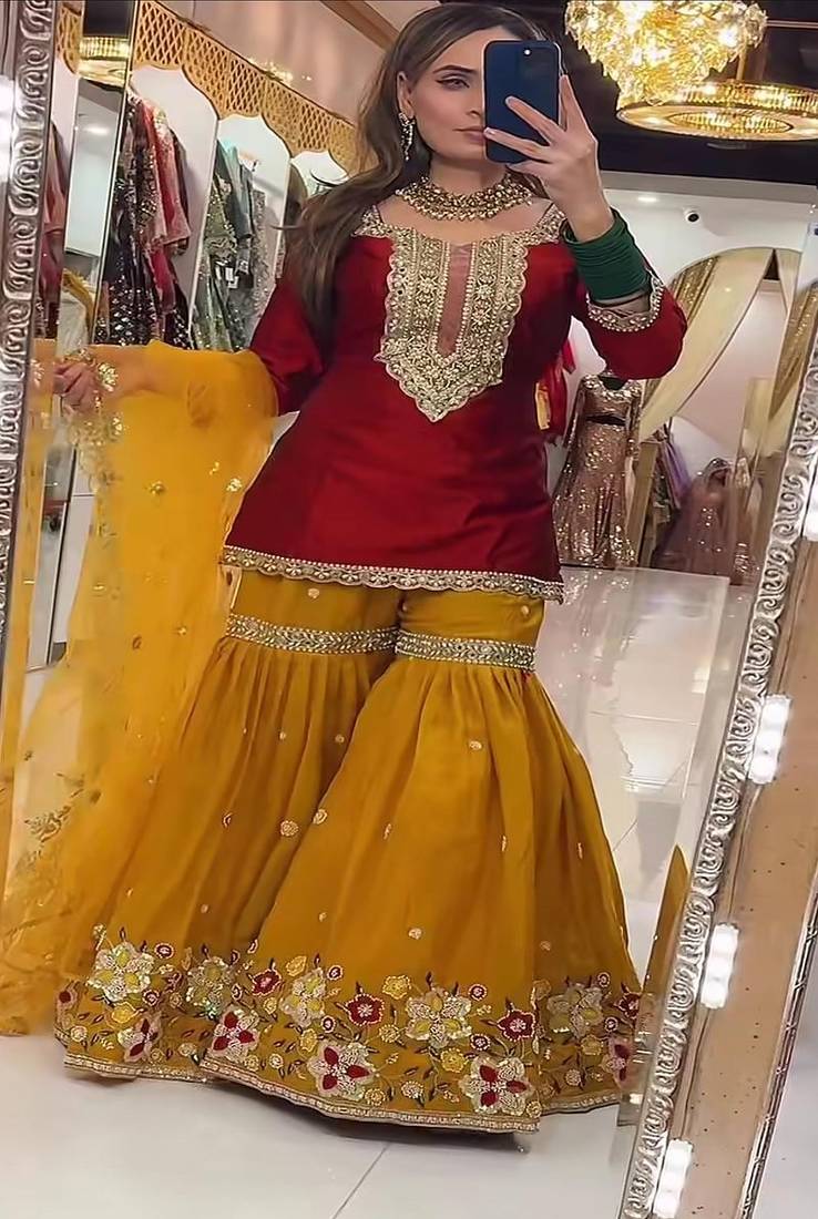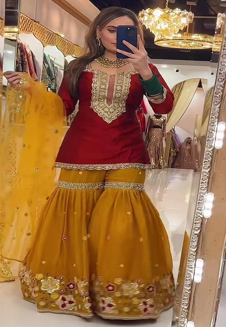 | Product Name | Dark Red & Mustard Yellow Sharara Set | |