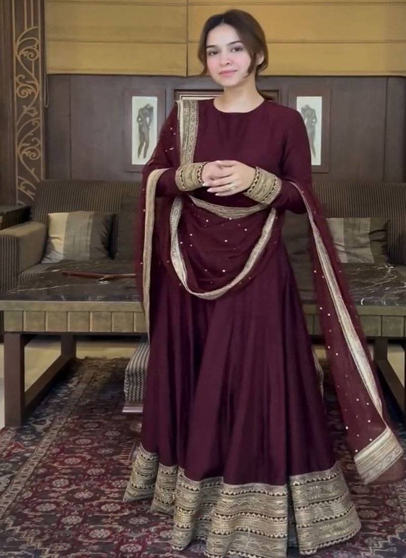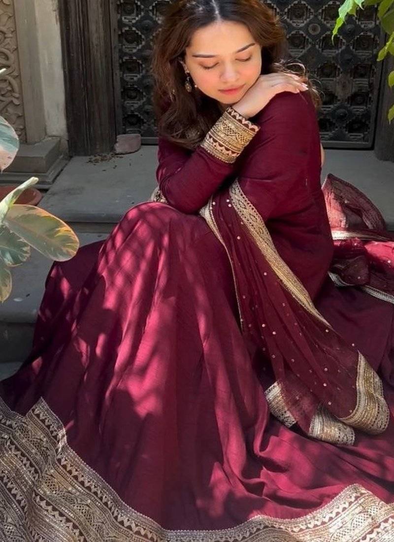 | Product Description | Radiate Grace In This Floor Length Maroon Anarkali Gown, Designed With An Embroidered Bodice And Delicate Sleeve Patterns. The Dupatta Adds A Traditional Touch To The Flowing Silhouette, Making It An Ideal Choice For Engagement Parties Or Grand Receptions. A Masterpiece Of Ethnic Craftsmanship. |