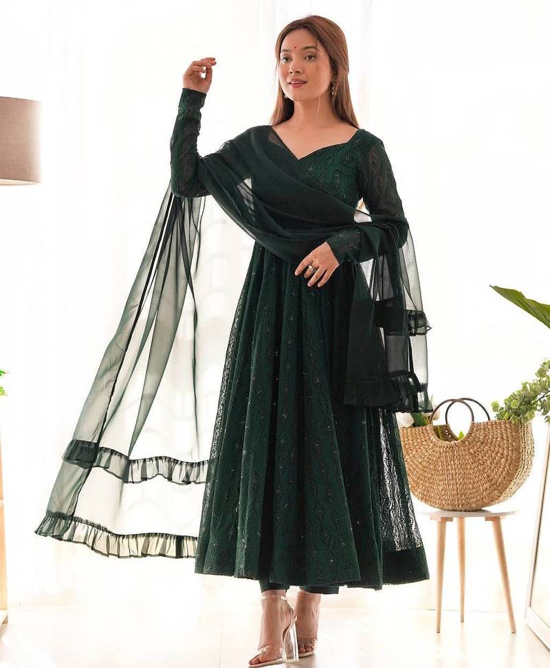 | Product Description | Rich Green Anarkali Gown With Subtle Textured Design And Matching Dupatta. The 4 Mtr Flared Silhouette Offers A Classy And Graceful Look. Perfect For Festive Parties, Evening Functions, And Wedding Events |