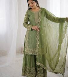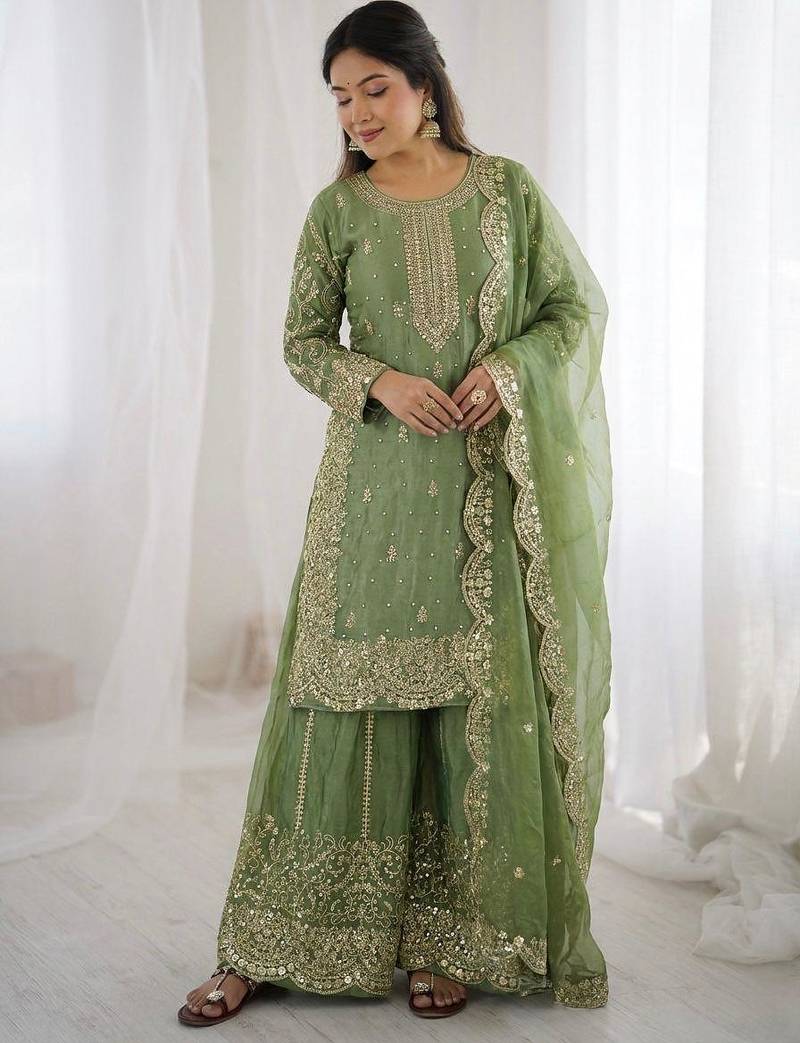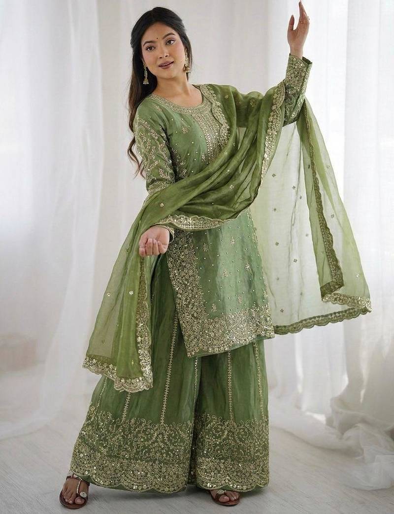 | Product Description | This Green Suit Showcases Rich Zari Embroidery Across The Kurta And Sharara. The Detailed Scalloped Dupatta Adds A Luxurious Finish. Perfect For Wedding Functions, Sangeet Nights, And Festive Celebrations. |